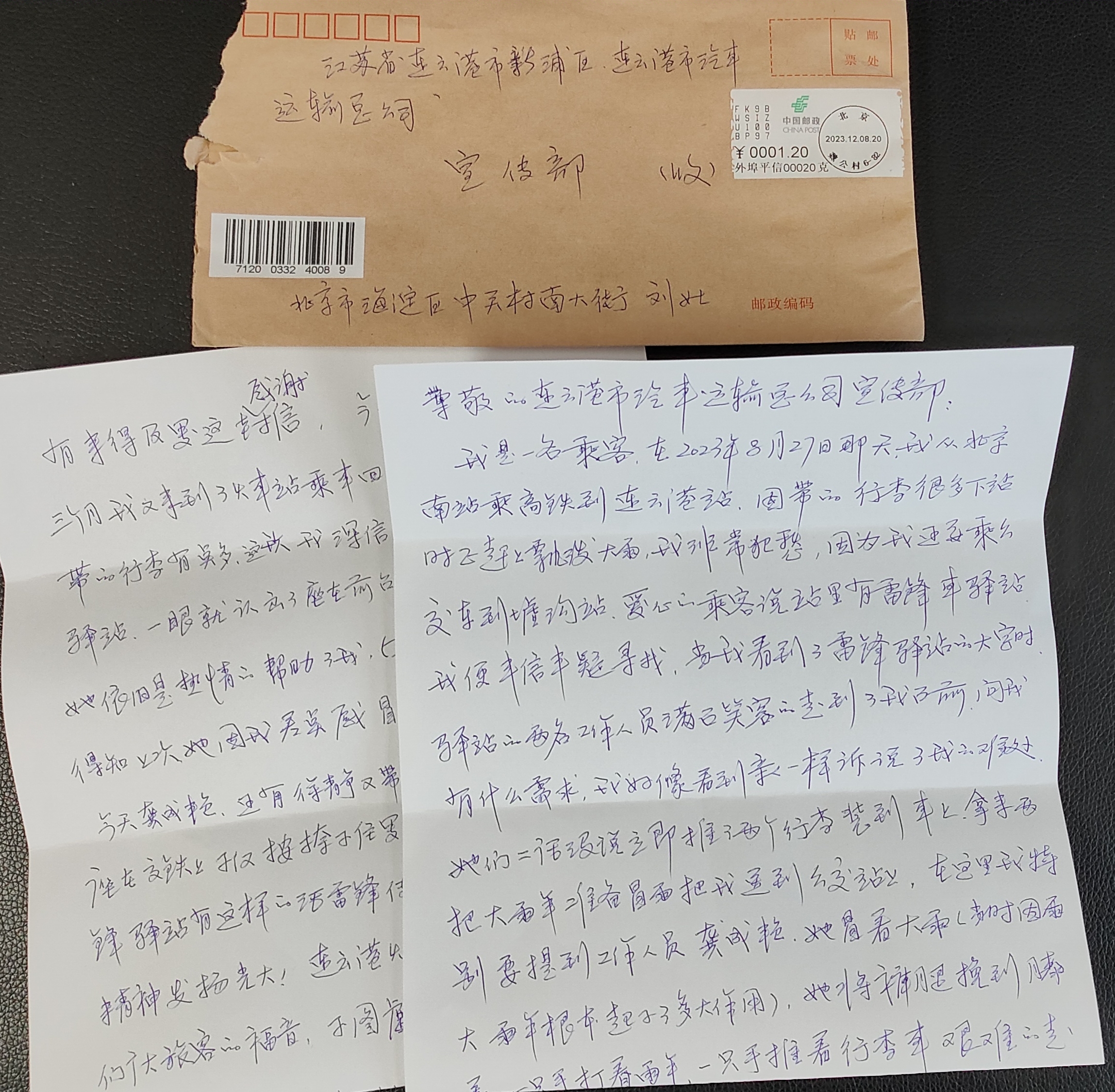 近日,连汽公司“雷锋车”驿站收到了来自七旬旅客刘女士的感谢信。信中,刘女士感激地描述了自己在8月份到连云港高铁站转乘时,遇到了大雨和行李多的困难。就在她发愁的时候,热心旅客告诉她可以找“雷锋车”驿站工作人员帮忙。
