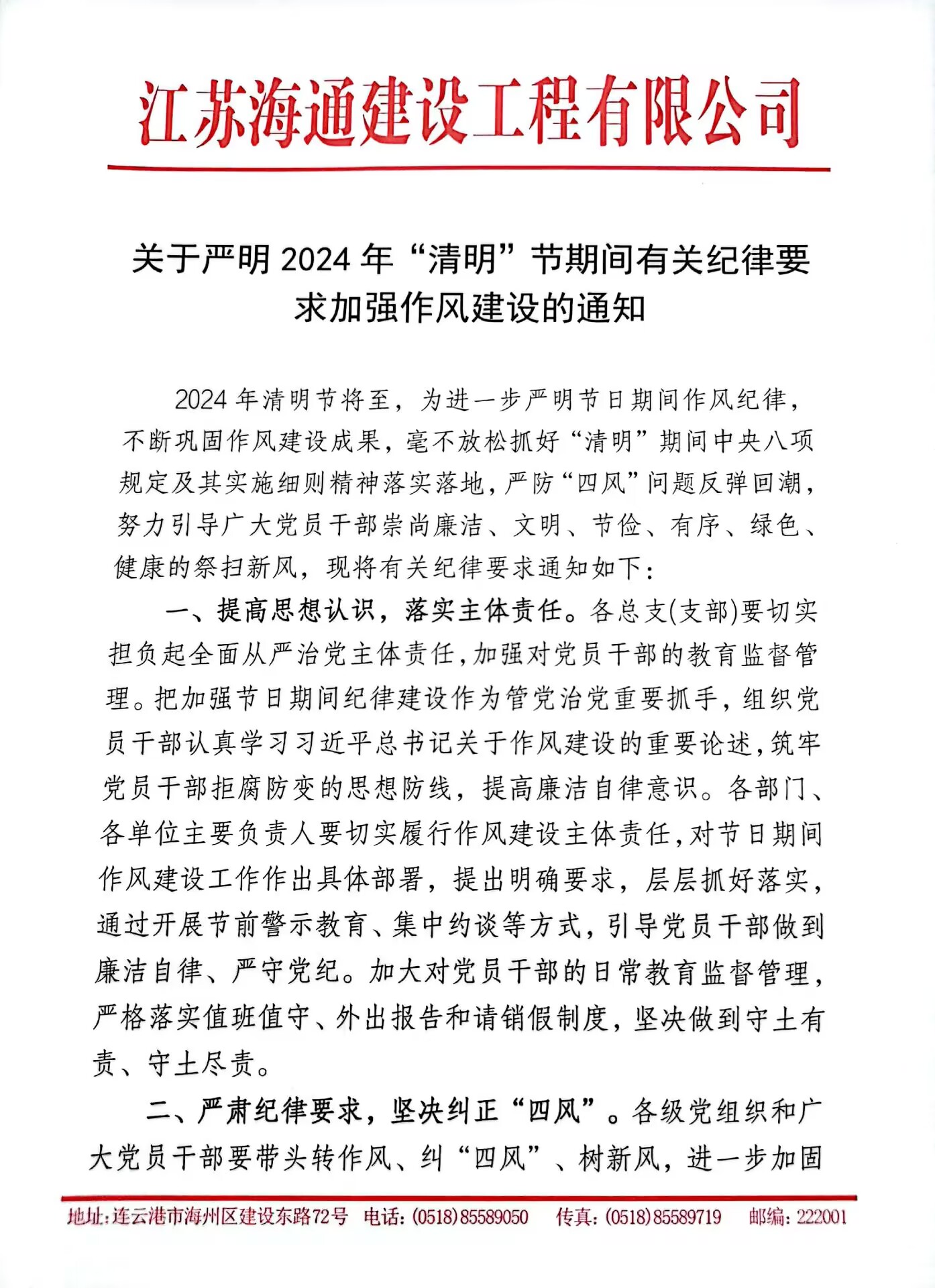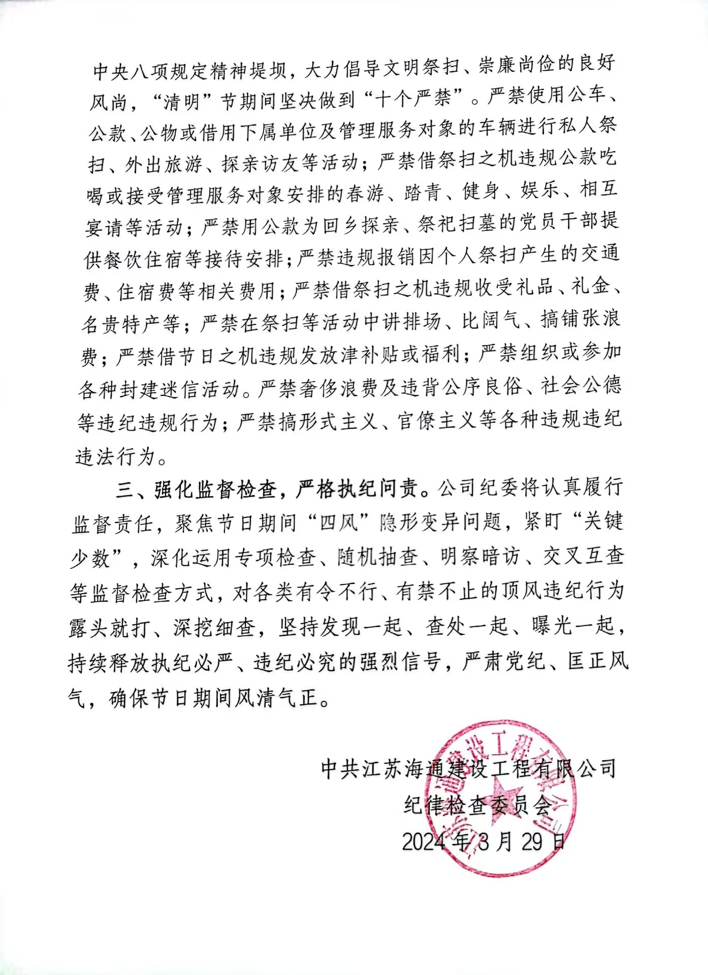 2024年清明节将至,为进一步严明工作纪律严守廉防线防止节日期间滋生“四风”问题,江苏海建公司纪委发出通知,提醒广大党员干部严格遵守中央八项规定精神,倡导廉洁、安全、文明、节俭、绿色的祭扫新风