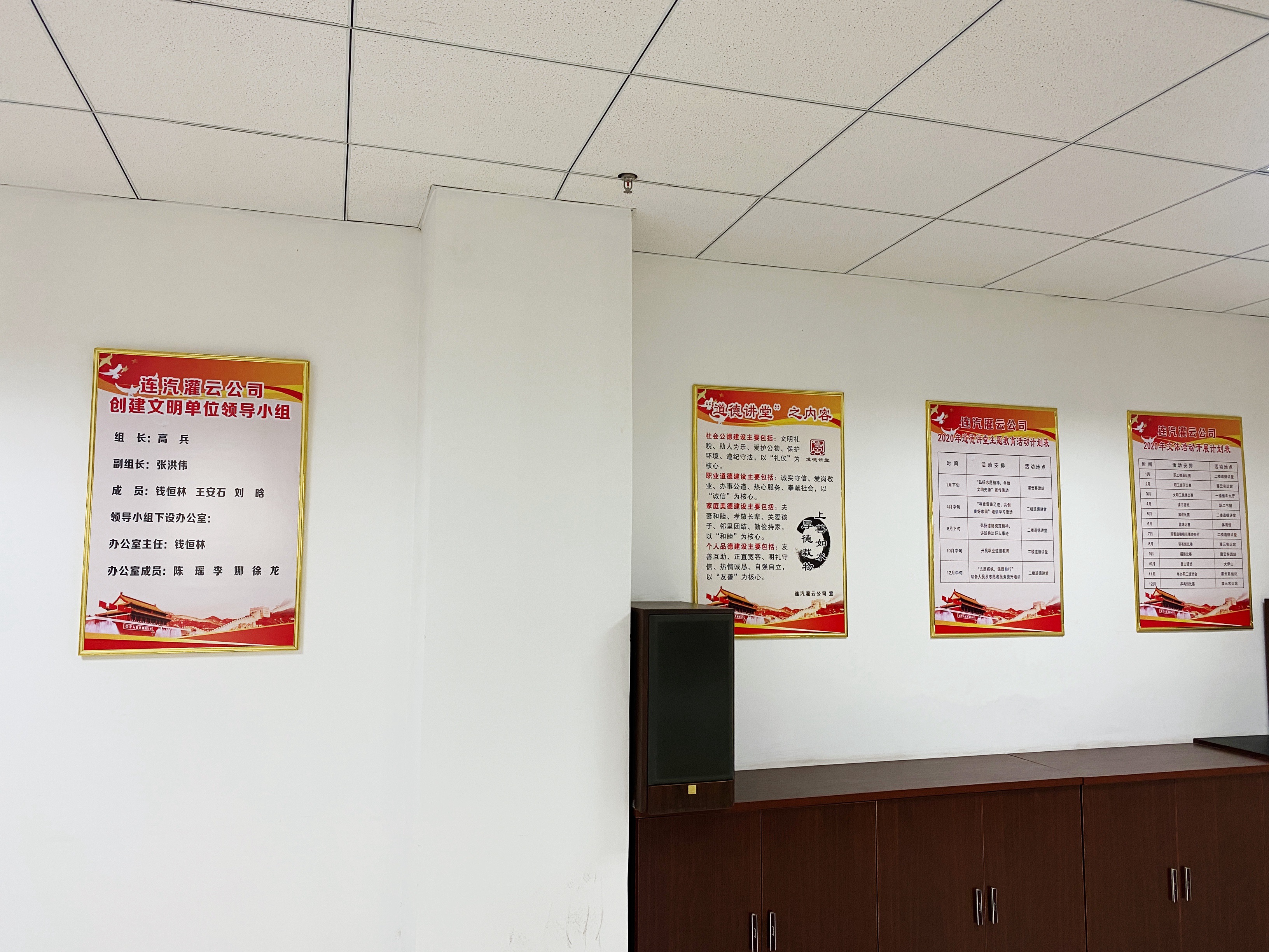 灌云公司通过认真制作标牌,布置道德讲堂,营造浓厚的德育氛围,建立了一套开展经常性宣讲活动的制度,规定结合各种纪念日,每年开讲不少于四次;挑选了一批来自身边感人事迹的好人、道德讲堂传统经典和道德格言,通过选树典型,组织广大职工学习。