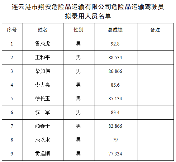 根据连云港市翔安危险品运输有限公司危险品运输驾驶员招聘公告有关规定和要求,现将本次招聘拟录用人员名单予以公示。 公示时间:2025年3月21日至3月27日