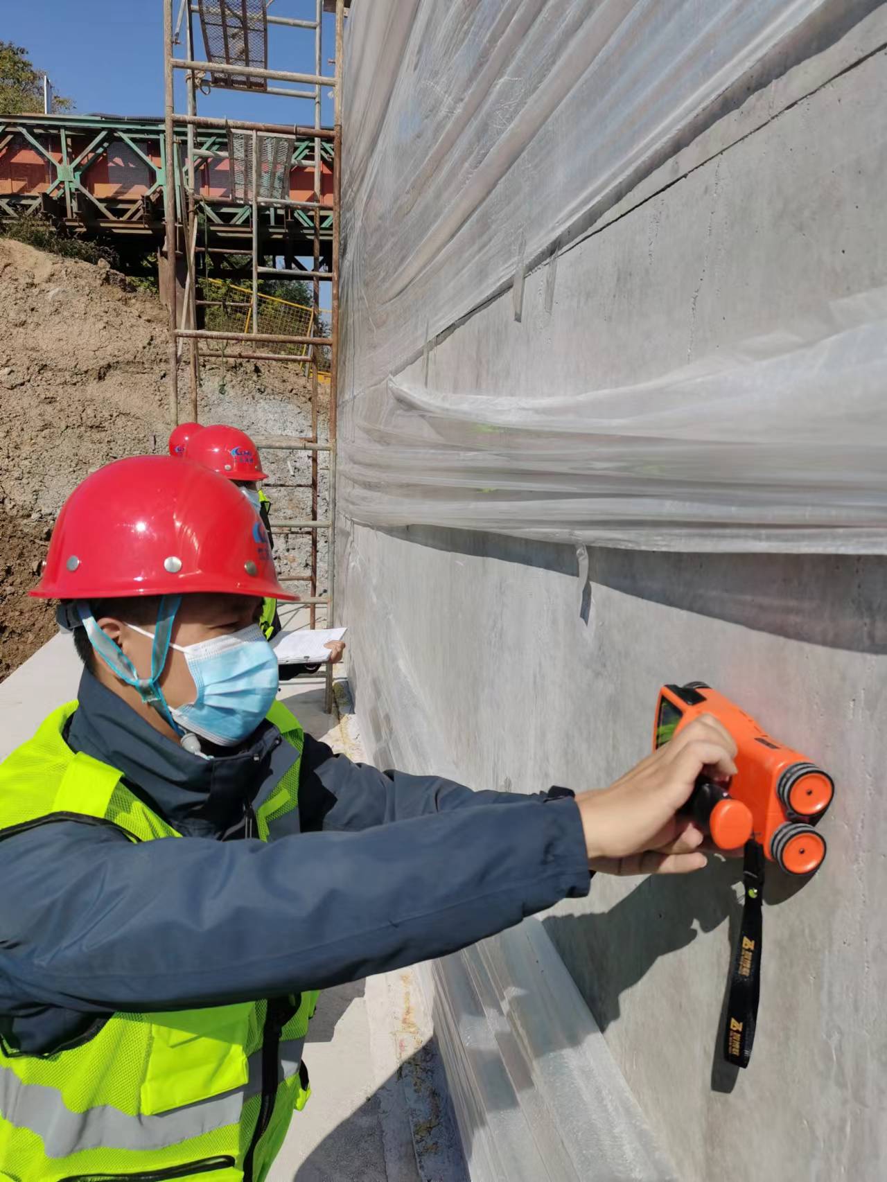 检查小组到来到板新线磕头桥改建工程项目施工现场,听取了项目部人员对工程进展情况进行简要汇报,并现场对部分墩、柱进行质量抽查。新丝路检测公司将及时出具《检测报告》,为项目的质量管控提供详实依据。
