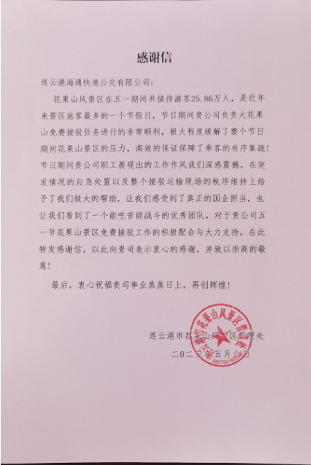 近日,花果山景区向市交通控股乐玩app最新版下载,乐玩(中国)权属公交乐玩app最新版下载,乐玩(中国)送来了一封感谢信,感谢公交乐玩app最新版下载,乐玩(中国)在五一期间高效的保障了游客的有序疏散。
