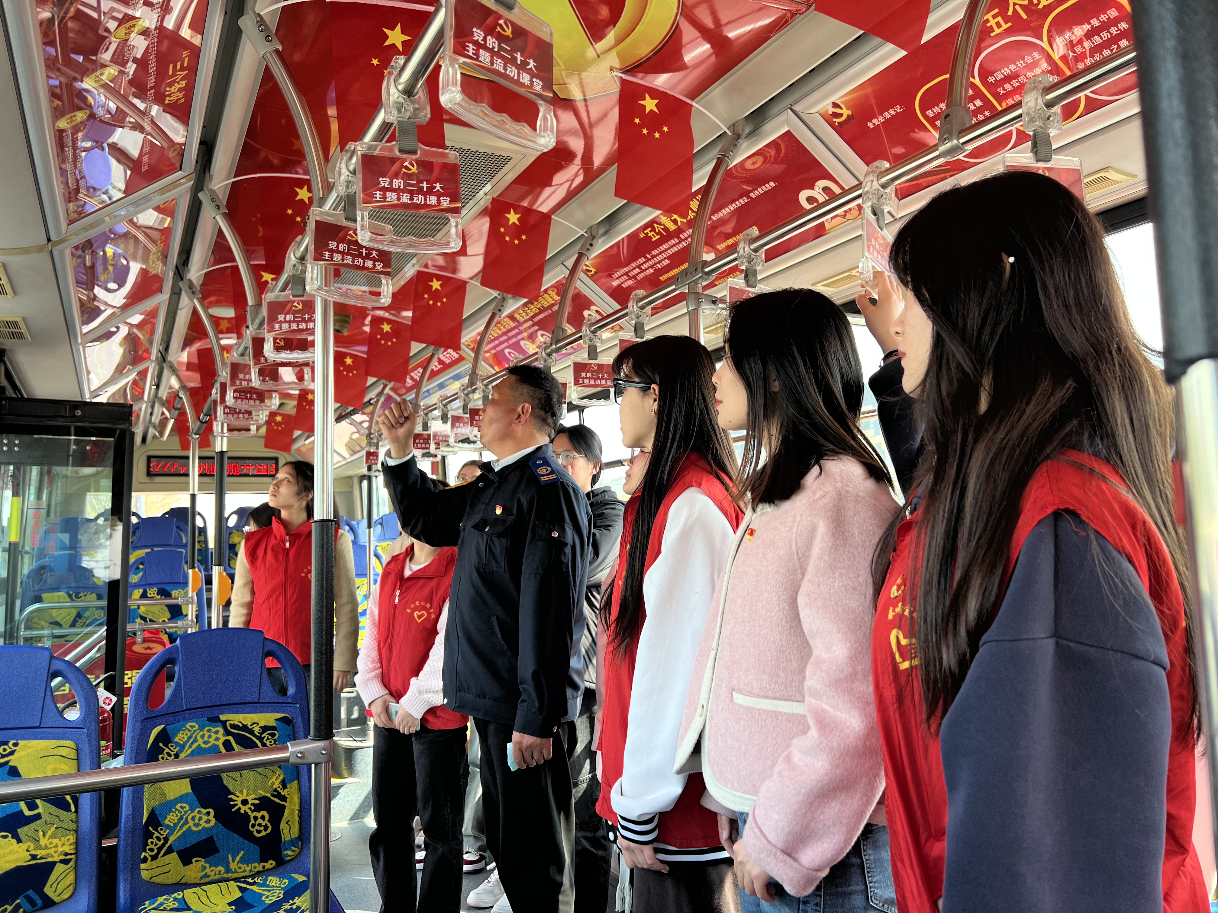 本次活动以学习宣传党的“二十大”精神为主线,利用公交车流动性强、覆盖面广、更贴近群众的优势,充分发挥公交车公益性宣传载体作用。活动中,公交20路驾驶员周卓文同志作为二十大宣讲员,带领师专12名党员学生乘坐“党的二十大”红色主题车厢,并向学生们讲授公交基层党员的学习感悟及劳模事迹。连云港师专学生党员通过公交车故事宣传、理论讲解、趣味互动,以亲和的形式向车上乘客宣讲党的“二十大”精神,帮助广大群众深入理解、准确把握报告精神,让党的好声音“直通”社会大众。