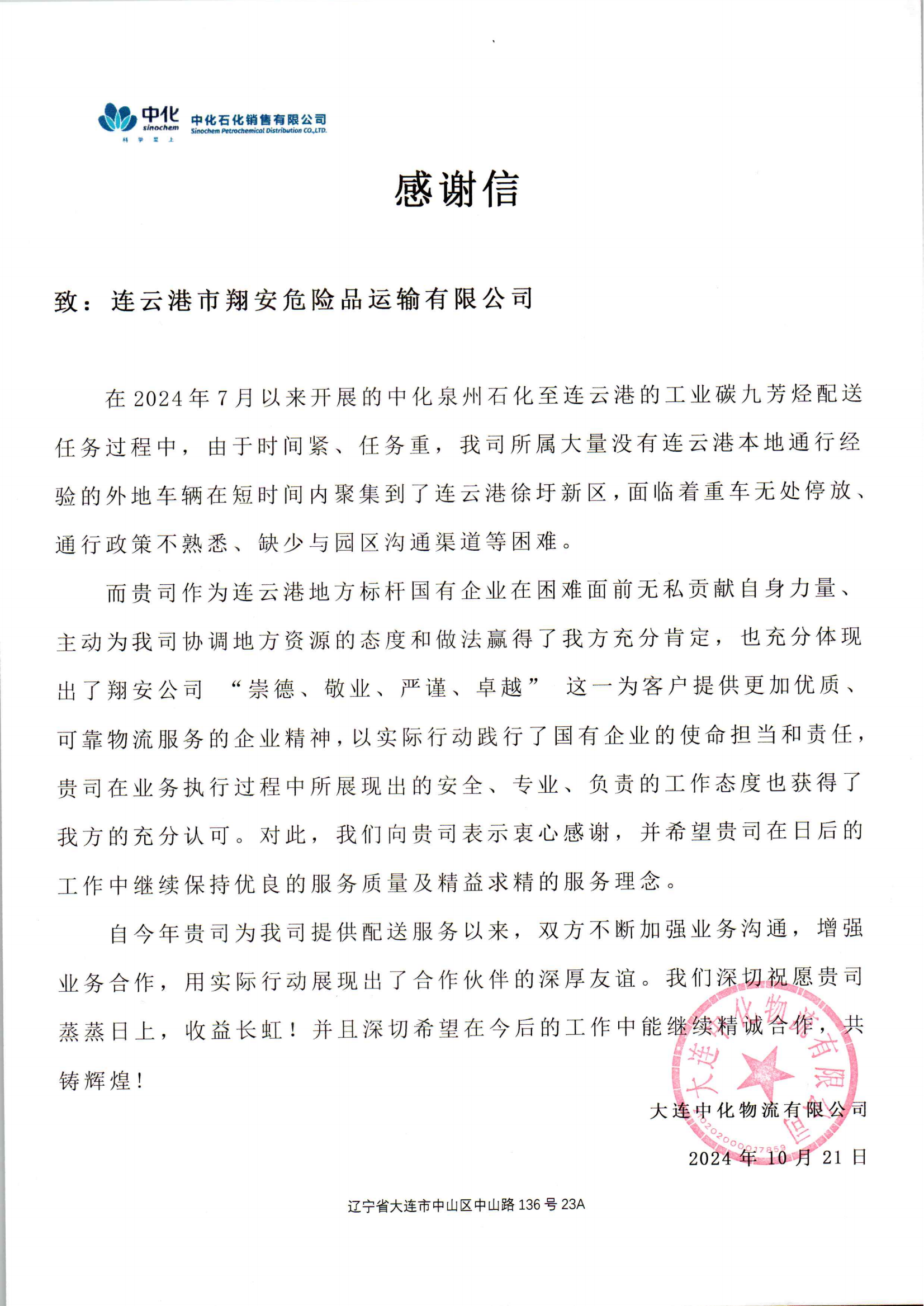 一封感谢信,既是对荣誉的承载,也是责任的体现,更是前进的动力。连汽翔安公司将继续坚持进取精神,坚定不移地提升服务水平,致力于为广大客户提供安全、优质、高效的危险品运输服务。
