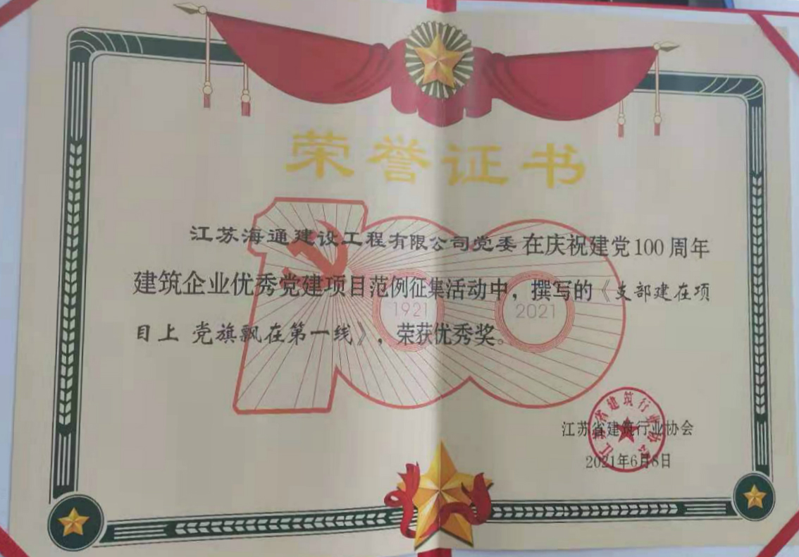 近日,由江苏省建筑行业协会组织开展的江苏省建筑企业党建工作经验交流会在苏州市顺利举办。会议现场发布了省建筑企业优秀党建项目获评名单,共106家企业入选,连云港交控乐玩app最新版下载,乐玩(中国)权属江苏海通建设工程公司党委报送的党建项目范例《支部建在项目部 党旗飘在第一线》,荣获优秀奖。