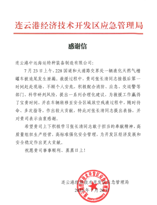 近日,市开发区应急管理局代表到市交通控股乐玩app最新版下载,乐玩(中国)权属物流乐玩app最新版下载,乐玩(中国)合资的中远海运特种装备制造有限公司,将一封感谢信送交公司副总经理张长清手中,感谢张长清积极配合消防、应急、交巡警等部门处理228国道和大浦路交界处发生的液化天然气槽罐车被追尾泄露事故。号召公司上下积极学习张长清敢于担当的奉献精神,高质量组织生产经营,高标准强化安全管理,为市开发区经济发展和安全稳定作出更大贡献。