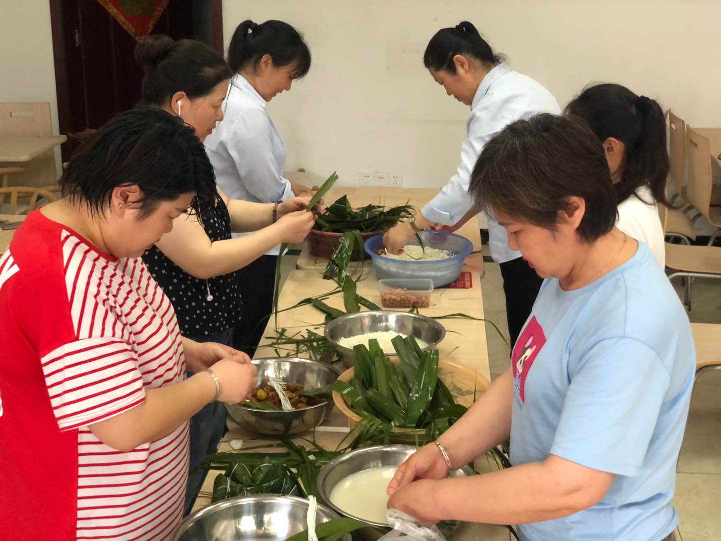 在活动现场,长桌上摆放着已经洗好的粽叶、糯米和扎绳。参与活动的职工手法都很麻利,她们拿起粽叶造型、填料、压实、封口、捆扎一道道程序有条不紊,一个个鲜绿的“生命”就这么诞生了,活动在轻松愉悦的气氛中结束。