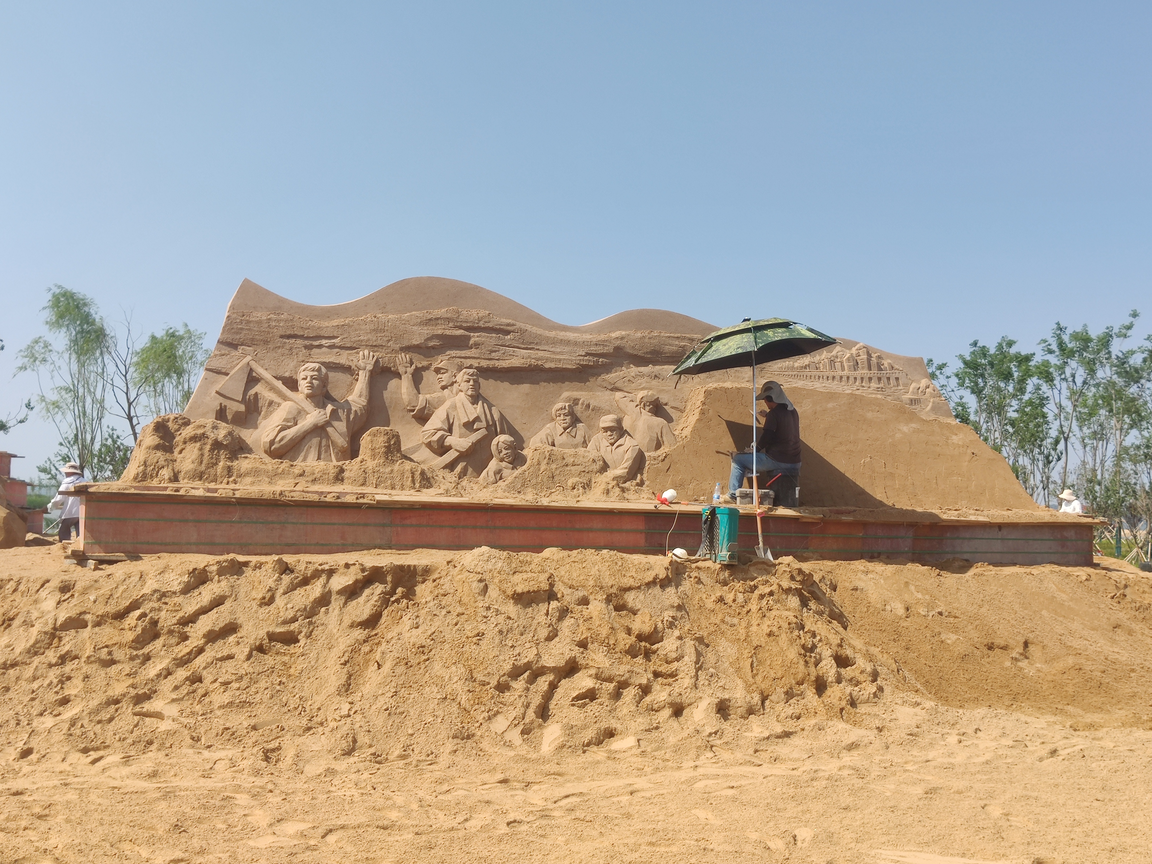 “黄金沙滩”围绕“沙”的元素设置了“趣味沙世界”主题区,打造七处主题沙雕,占地1100平方米,包括一个主雕塑和六处分雕塑,主雕塑为13米长、5米宽、3.6米高,分雕塑均为4米长、4米宽、3米高,七个雕塑共同构成一个大型组合沙雕展览区。大型组合沙雕展览区的各个单位沙雕围绕一个主题使沙雕作品具有较强的故事性和趣味性,增强作品的文化内涵。同时,在组合沙雕上将设计与主题相协调的游览路线,使游客可走进沙雕,从各个角度观赏,体验乐趣,将进一步增强沙雕场景的真实性和艺术效果。目前各沙雕已颇具雏形,预计6月20日前完成全部沙雕雕刻。