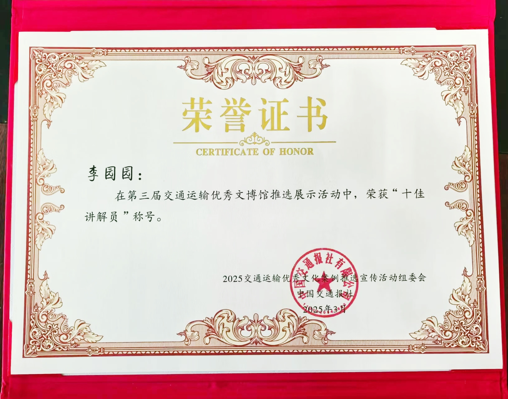 在此次文博馆集中展示活动中,李园园代表“雷锋车”事迹陈列馆和来自全国各地的30家交通运输文博馆共同展示了新时代交通人的风采。李园园以饱满的热情和优秀的舞台表现,生动展现了“雷锋车”组在成立62年间,风雨无阻、薪火相传,为旅客排忧解难的动人历程。她的表现深深打动了评委和现场观众,最终斩获“十佳讲解员”殊荣。