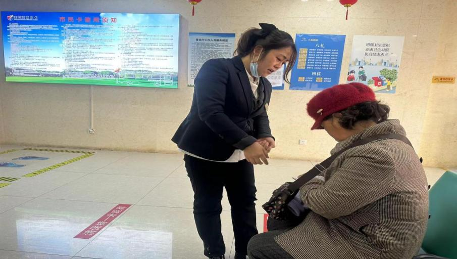 程涧赶忙把老人扶到休息区坐下,安抚老人的情绪。在随后交谈中程涧了解到,婆婆的老伴已经过世,儿女又长期在外地,平日里也不怎么出门,因为自己好友生病了想去探望她才乘坐公交车。随后程涧立即查看卡的问题,才发现因为老人家忘记年审了所以导致卡不能正常使用,她立即为老人家办理年审业务,并且把营业厅的服务电话保存到老人的手机上,还嘱咐老人家以后遇到这种情况可以打电话联系上门服务。办理完业务后,程涧搀扶着老年人走下楼梯来到轮椅旁,并护送老人前往公交站台等候公交车的到来。老人一边走一边激动地握着程涧的手说着感谢的话语。