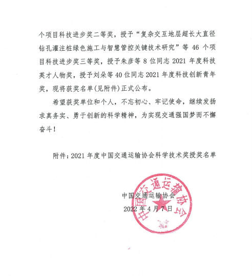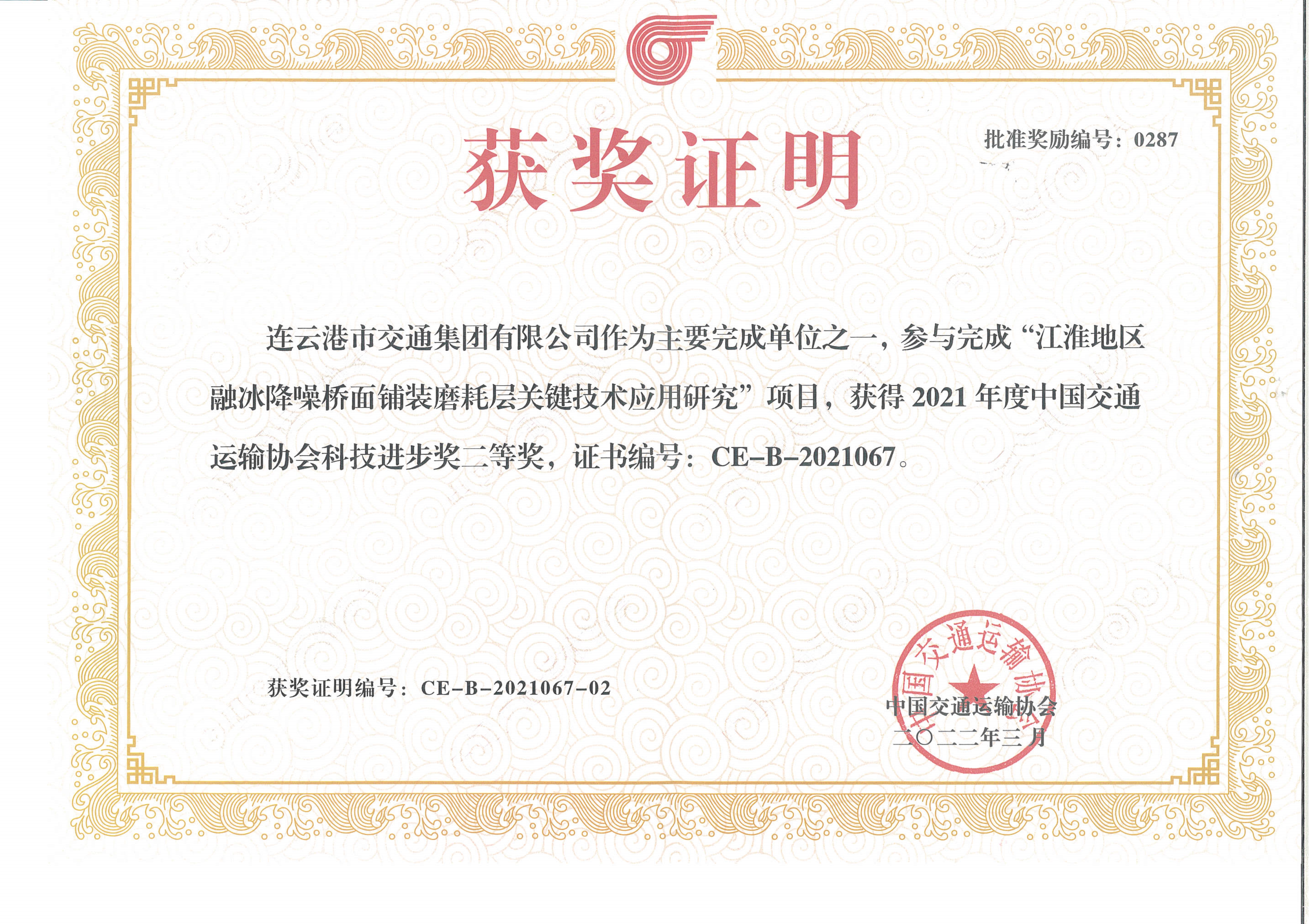 近日,中国交通运输协会发布了“2021年度中国交通运输协会科学技术奖”获奖项目名单,交通乐玩app最新版下载,乐玩(中国)联合苏交科乐玩app最新版下载,乐玩(中国)等单位申报的“江淮地区融冰降噪桥面铺装磨耗层关键技术应用研究”项目荣获中国交通运输协会科技进步奖二等奖。