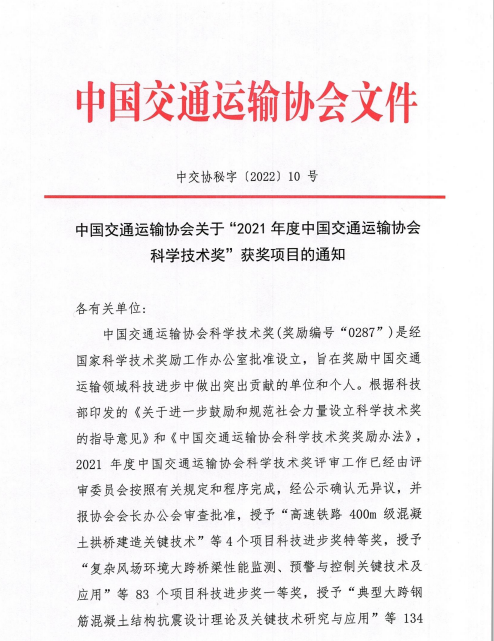中国交通运输协会科学技术奖由国家科学技术奖励工作办公室批准设立,旨在奖励中国交通运输领域中做出突出贡献的单位和个人,是国家科技奖励的重要组成部分,被誉为“全国交通运输行业最高科技奖”。