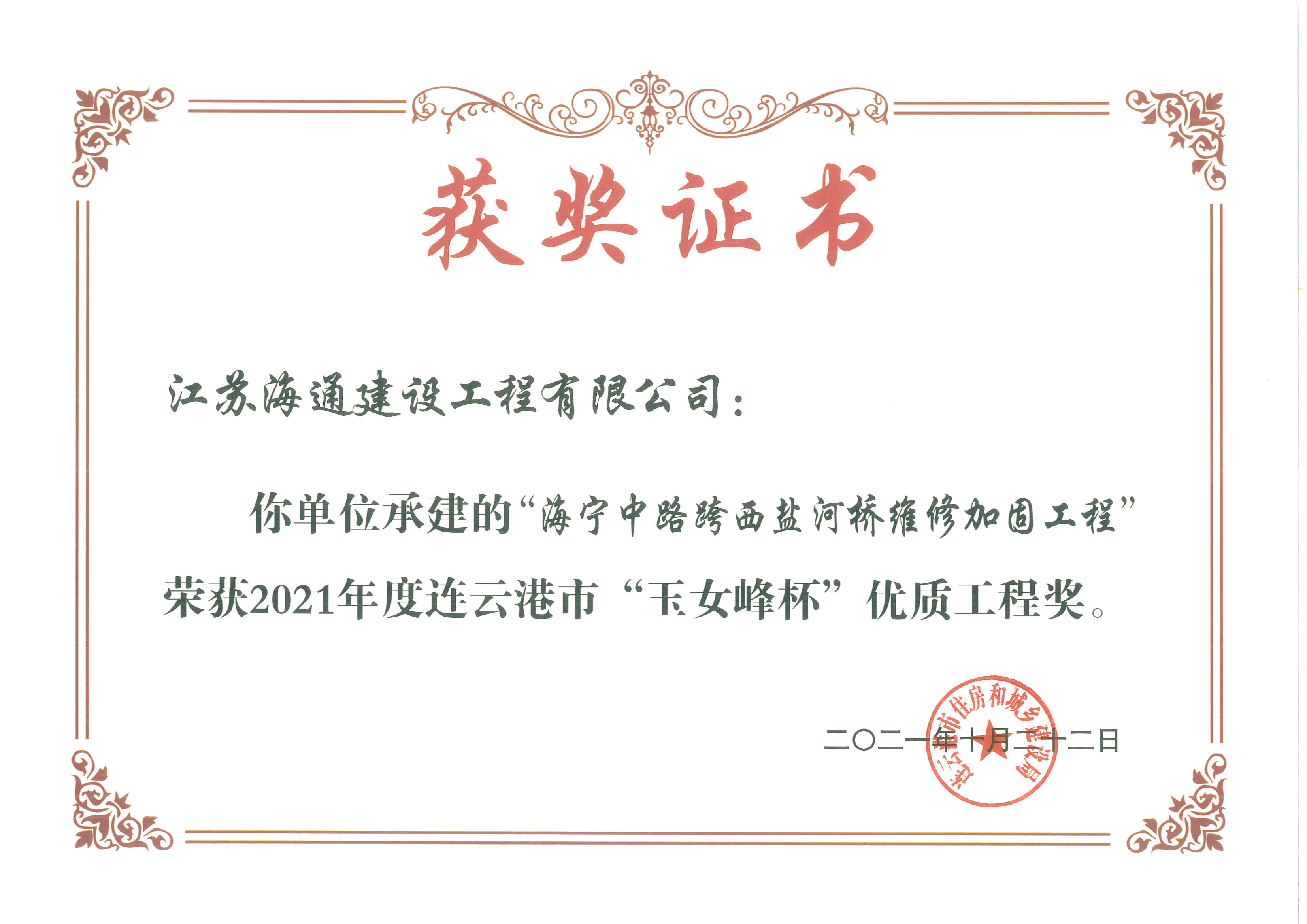 近日,连云港市住房和城乡建设局在网站公布了连建质安〔2021〕359号文件《关于公布2021度连云港市“玉女峰杯”优质工程获奖项目的通知》并颁发了获奖证书。江苏海建公司承建的两个市政项目“海宁中路跨西沿河桥维修加固工程 ”和“节能一路(环保二路-环保十路)新建工程”获得2021年度连云港市“玉女峰杯”优质工程奖。