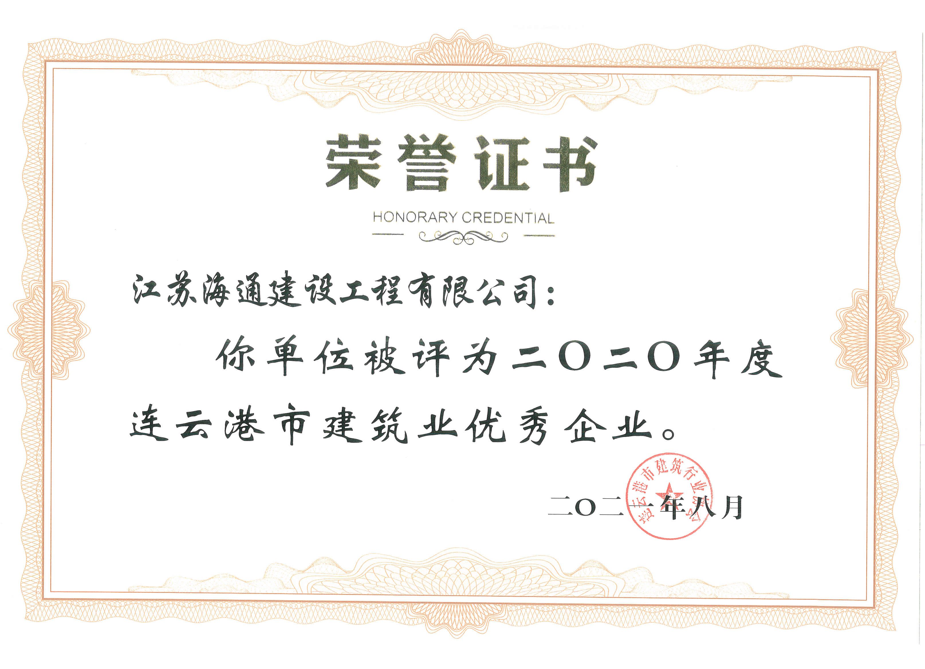 江苏海建公司荣获“2020年度连云港市建筑业优秀企业”
