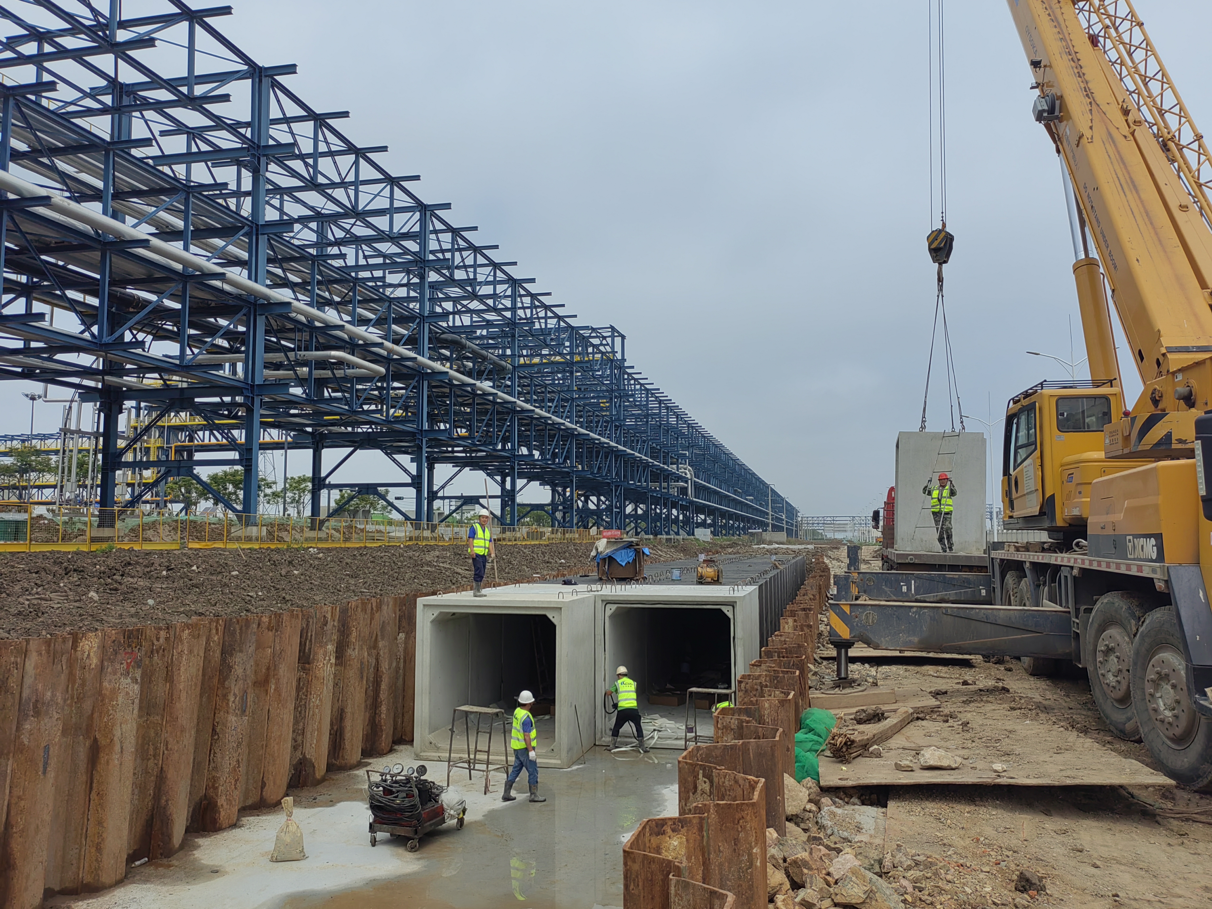 日前,位于徐圩新区石化基地内部的荣泰仓储西侧道口接线道路及桥梁新建工程石化二道排水工程正在进行排水箱涵施工。截至目前,已完成现有工作断面的基坑开挖及地基处理约350米、钢板桩支护1200根、围檩及钢支撑安装200多吨。排水工程主体结构箱涵安装,已完成约280米,占比约70%。