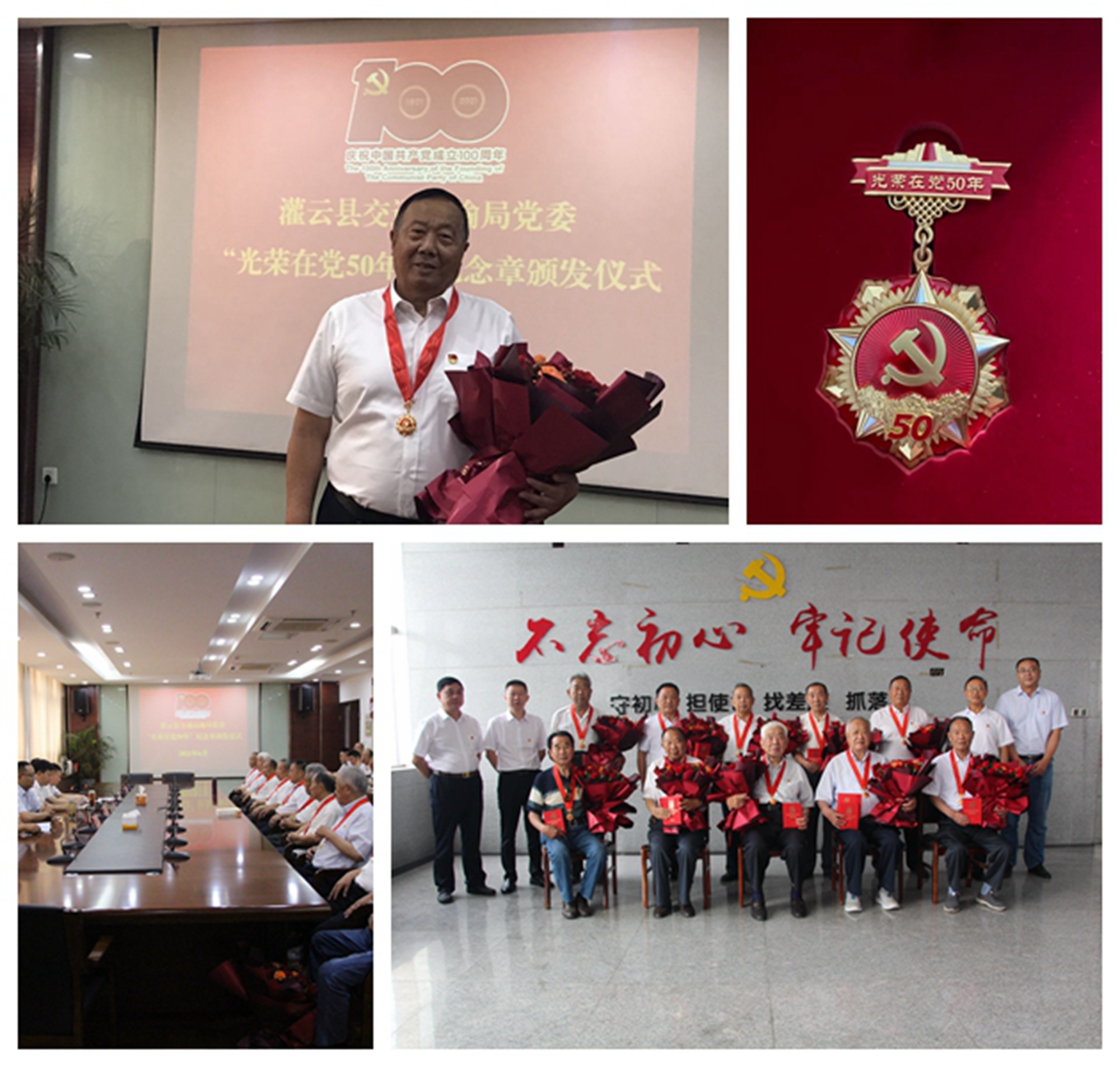 6月25日上午,县交通局810会议室举行“光荣在党50年”纪念章颁发仪式。灌云公司支部副书记李浩、老党员代表侍录应邀出席仪式。