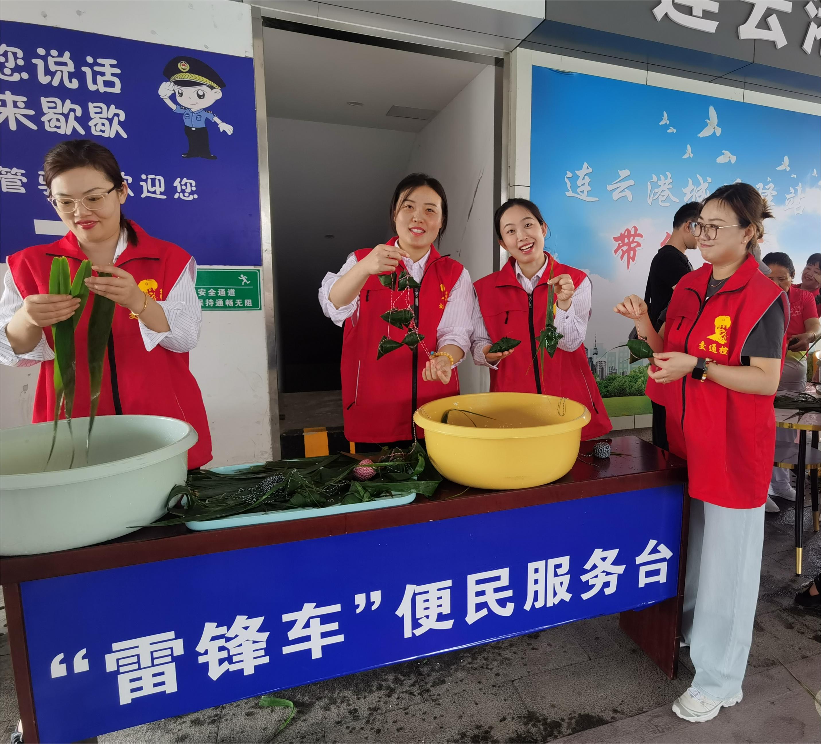 “雷锋车”手们带着粽子和香囊在连云港市高铁站的“雷锋车”驿站前,为南来北往的旅客送上节日祝福。每个收到粽子和香囊的旅客都露出了灿烂笑容。来连云港市旅游的张大爷接过粽子连声称赞:“我带小孙子第一次到连云港市来旅游就遇到你们的端午节活动,让我在旅途中就吃到了端午节的第一个粽子,太开心了!”。