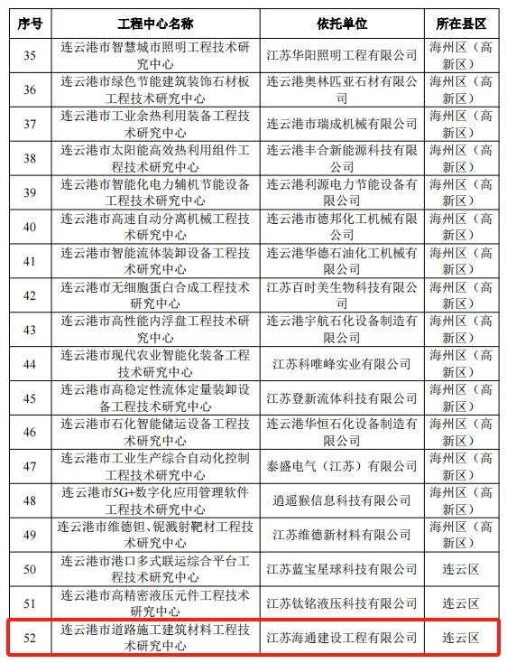 近日,从连云港市科技局获悉,海建公司“连云港市道路施工建筑材料工程技术研究中心”被认定为市级工程技术研究中心。