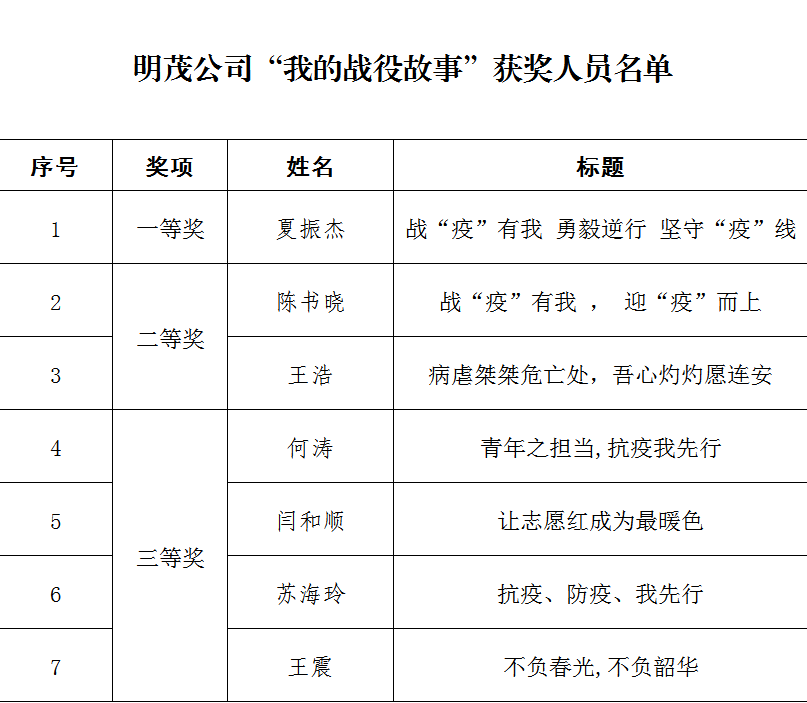 此次活动得到了公司员工们的积极响应和支持,共收到征文30余篇,并在公司公众号刊登评选。征文活动截止后,本着公平、公正的原则,公司邀请了相关领域的专家对全部有效应征稿件进行了认真细致的评审工作,经过网络和评委的双重投票最终评选出7部获奖作品。其中夏振杰《战“疫”有我 勇毅逆行 坚守“疫”线》获一等奖、陈书晓《战“疫”有我 迎“疫”而上》、王浩《病虐桀桀危亡处,吾心灼灼愿连安》获二等奖、何涛、闫和顺、苏海玲、王震获三等奖。