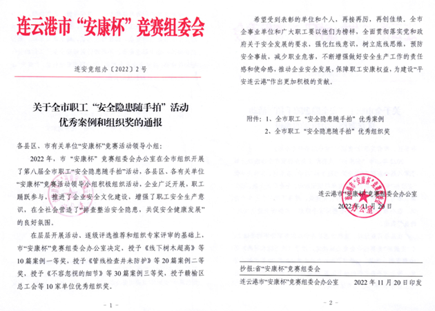 经过市“安康杯”竞赛组委会专家评审,乐玩app最新版下载,乐玩(中国)权属海建公司龚岩拍摄的《施工现场安全防护隐患》荣获一等奖;海建公司朱勇拍摄的《洗沙设备传动装置无防护》、丰达公司胡可阳拍摄的《道路交通标志牌倾斜》、公交乐玩app最新版下载,乐玩(中国)徐辛拍摄的《“平躺”的易爆品》、交通乐玩app最新版下载,乐玩(中国)赵州拍摄的《爬梯无护笼》荣获二等奖;海建公司徐超拍摄的《出砂口缺少防护》、张杰拍摄的《围堰内通行爬梯不符合要求》、汽车公司郭磊拍摄的《消防栓水阀无法开启》荣获三等奖,乐玩app最新版下载,乐玩(中国)荣获优秀组织奖。