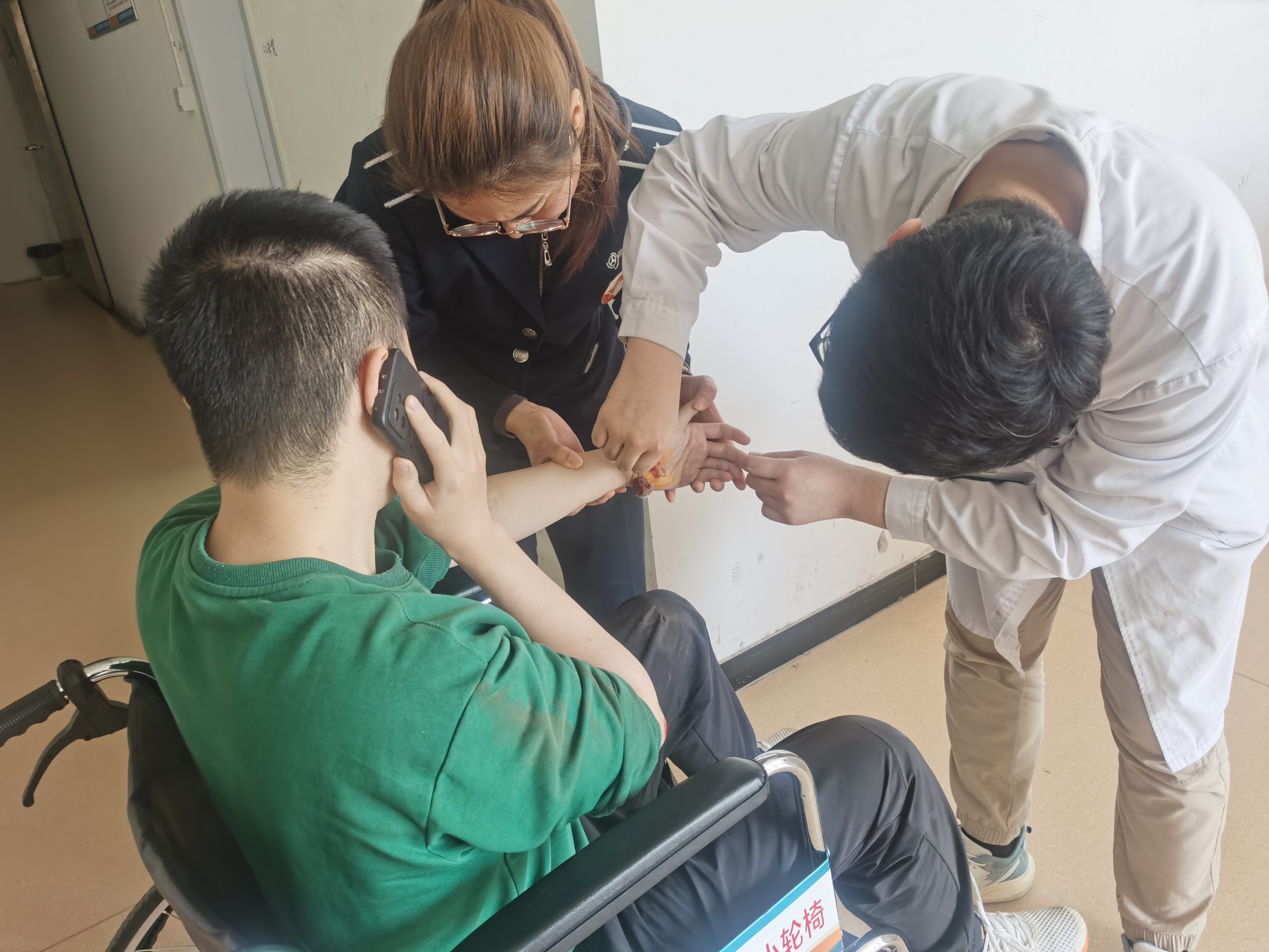 事情发生在上午8时许,正值“五一”劳动节运输高峰期,“雷锋车”驿站来了一位行走缓慢的男旅客寻求帮助。经询问得知,该旅客姓贺,今年30岁,此次独自坐高铁从西安回连云港。由于近期工作比较劳累,今早赶高铁未用早饭处于饥饿状态,身体有些不舒服,下台阶时突然眼前一黑,一脚踩空不慎摔伤,两只胳膊破皮流血并疼痛不止。在询问贺先生对碘伏等消毒用品无过敏反应后,“雷锋车”手吕红和芈丹对他的伤口进行了简单的清洗、消毒、包扎等应急处理,暂时止住了伤口的出血。但此时芈丹发现贺先生面色苍白,左手胳膊无力且疼痛,为了不耽误治疗,在征得贺先生的同意后,芈丹和吕红立即用轮椅将贺先生送往附近医院救治,同时也联系了贺先生的家人。