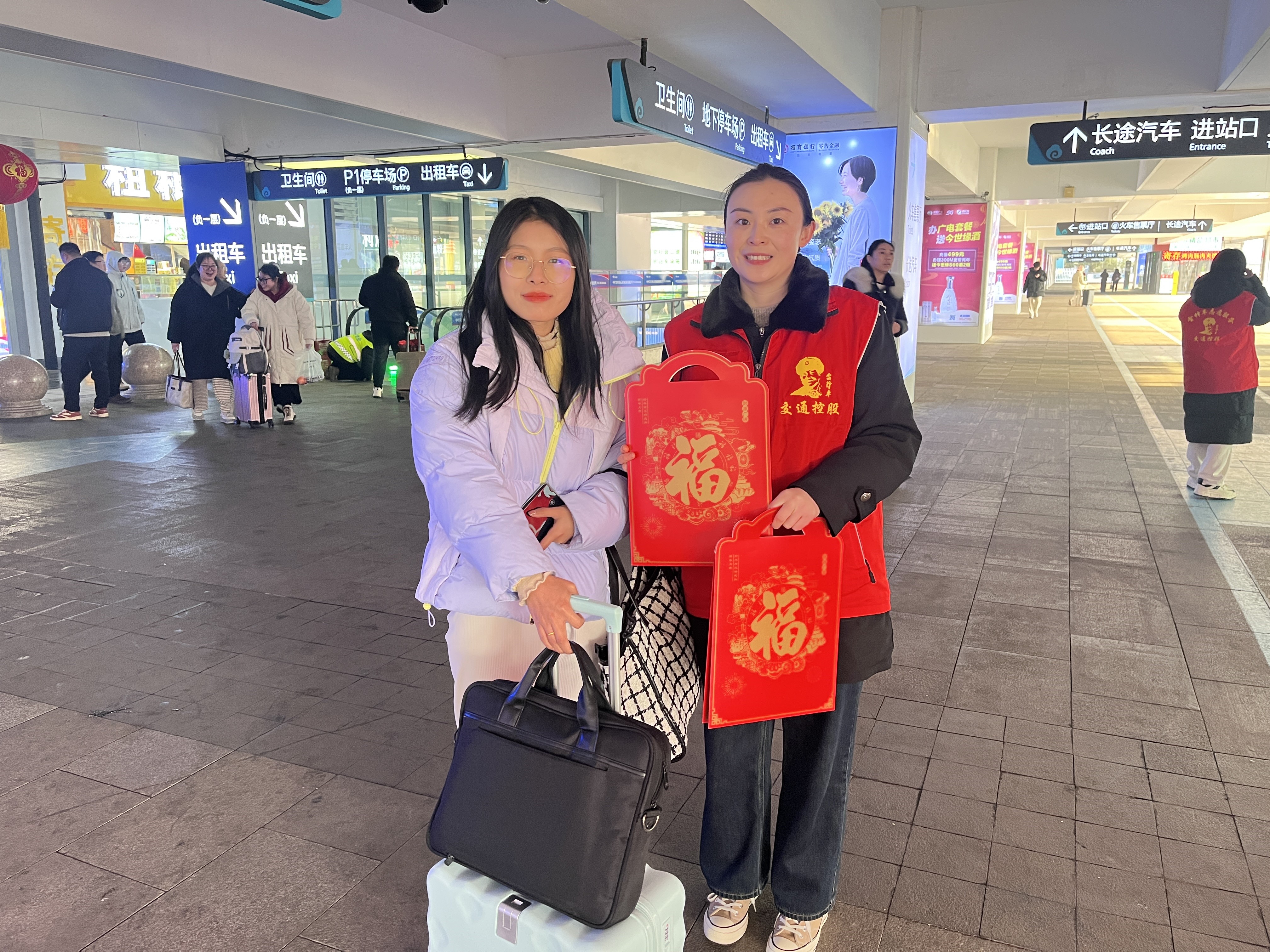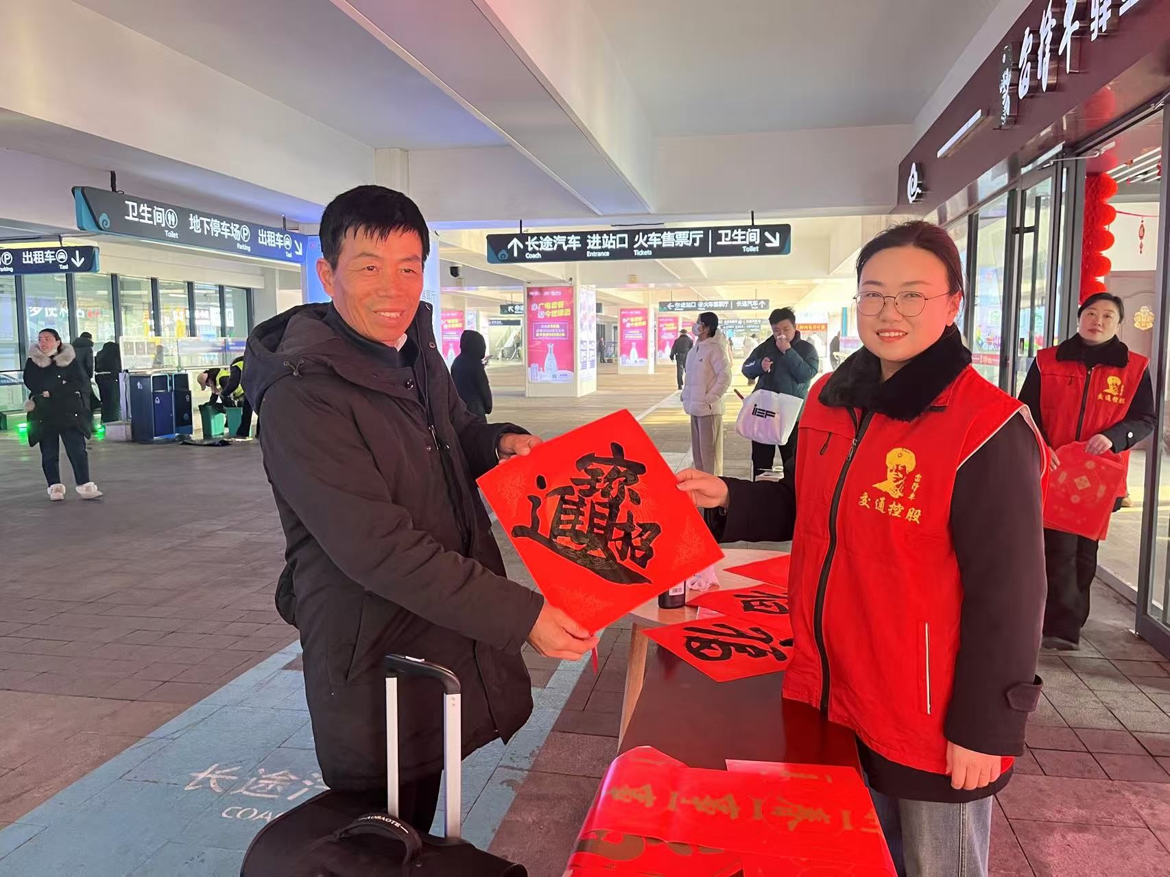 很快,旅客们纷纷围拢过来,挑选自己心仪的春联。现场气氛热烈而温馨,大家脸上都洋溢着喜悦的笑容。在外务工归家的张先生拿着刚刚挑选到的春联,激动地说道:“在回家的路上能收到这么喜庆的春联,心里别提多暖了,感觉新年的氛围一下子就浓了。” 志愿者们穿梭在人群中,一边帮忙递春联,一边与旅客亲切地唠着家常,详细询问他们的返乡路程,还不忘贴心地嘱咐他们注意旅途安全。