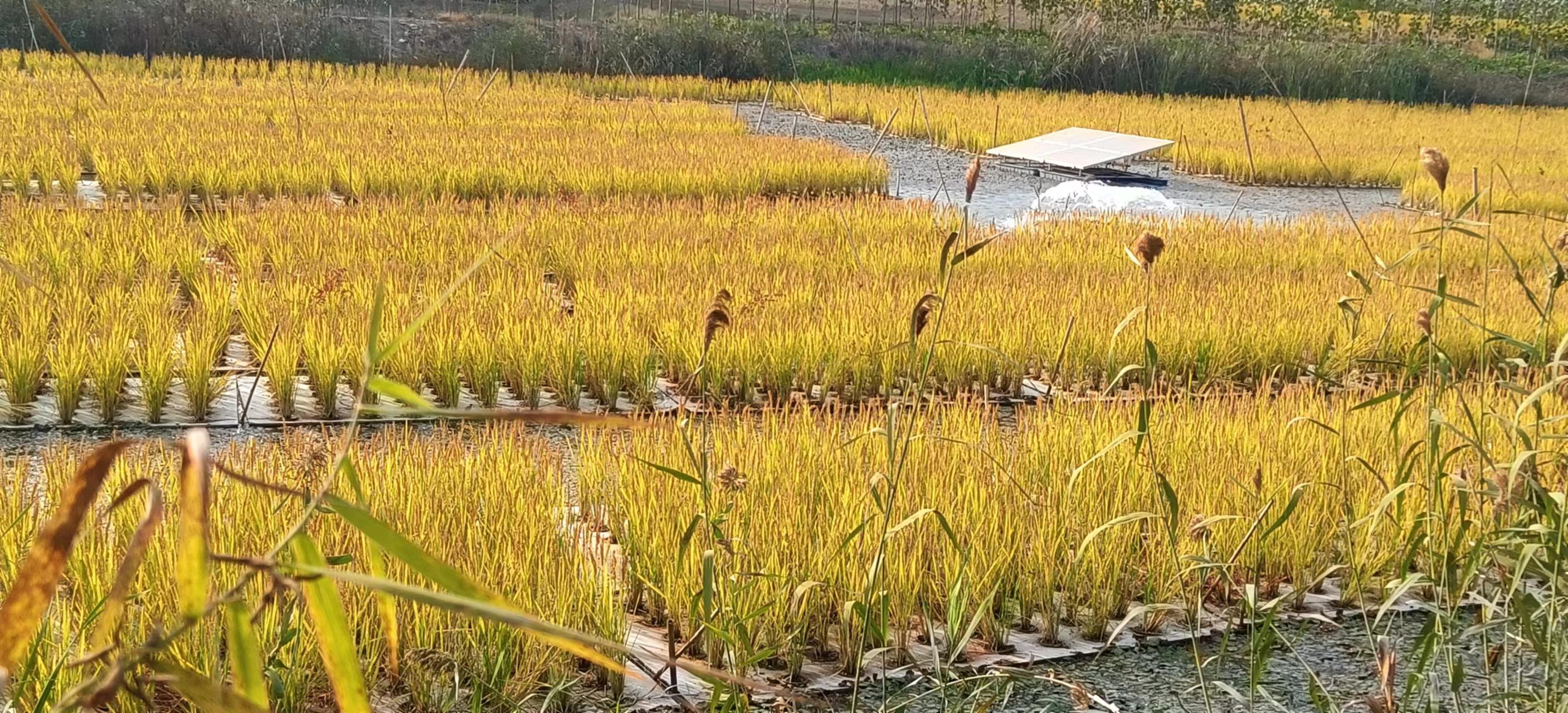 金秋十月,石梁河水库葛沟村水上稻田历尽近半年的成长,长势喜人,空气中弥漫着清新的稻香,成熟的稻子在秋风的吹拂下泛着金色的浪花,呈现出丰收在望的景象。