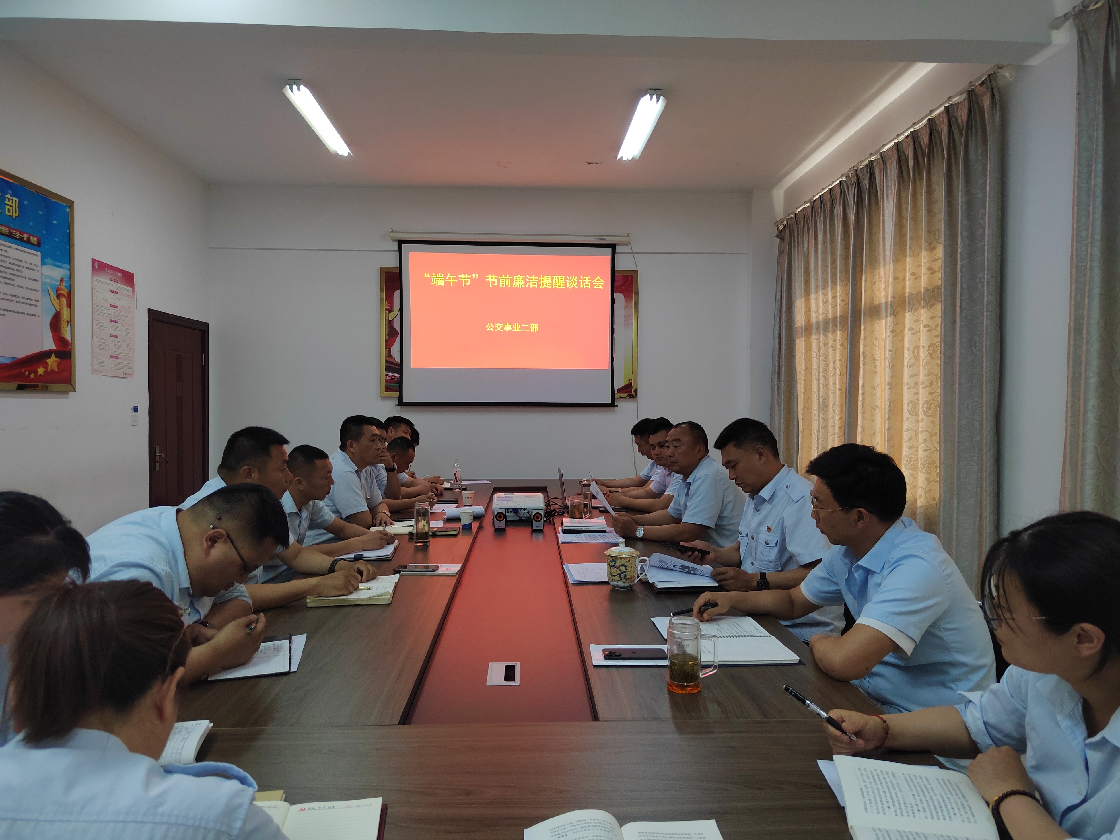 6月6日,公交事业二部召开端午节前党风廉政建设专题会议,组织班子成员、三级干部、党员、积极分子共计20人开展节前廉洁提醒谈话。