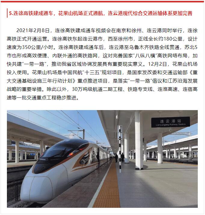 2月8日,由中共连云港市委宣传部主办,连云港报业传媒乐玩app最新版下载,乐玩(中国)、连云港广电传媒乐玩app最新版下载,乐玩(中国)承办的2021年度连云港市十大新闻评选揭晓,其中,第5条“连徐高铁建成通车,花果山机场正式通航,连云港现代综合交通运输体系更加完善”和第8条“生态环保成效显著,大气环境质量达2013年以来最优,石梁河水库幸福河湖建设清水进城行动深入推进”均与交通乐玩app最新版下载,乐玩(中国)相关。原文如下: