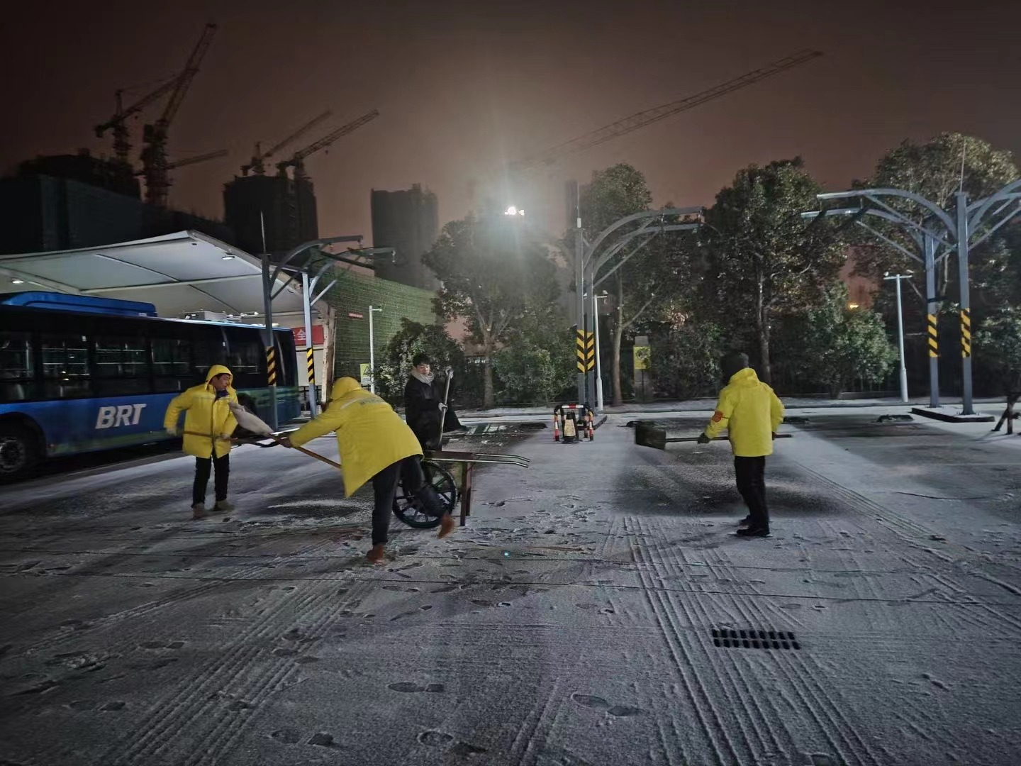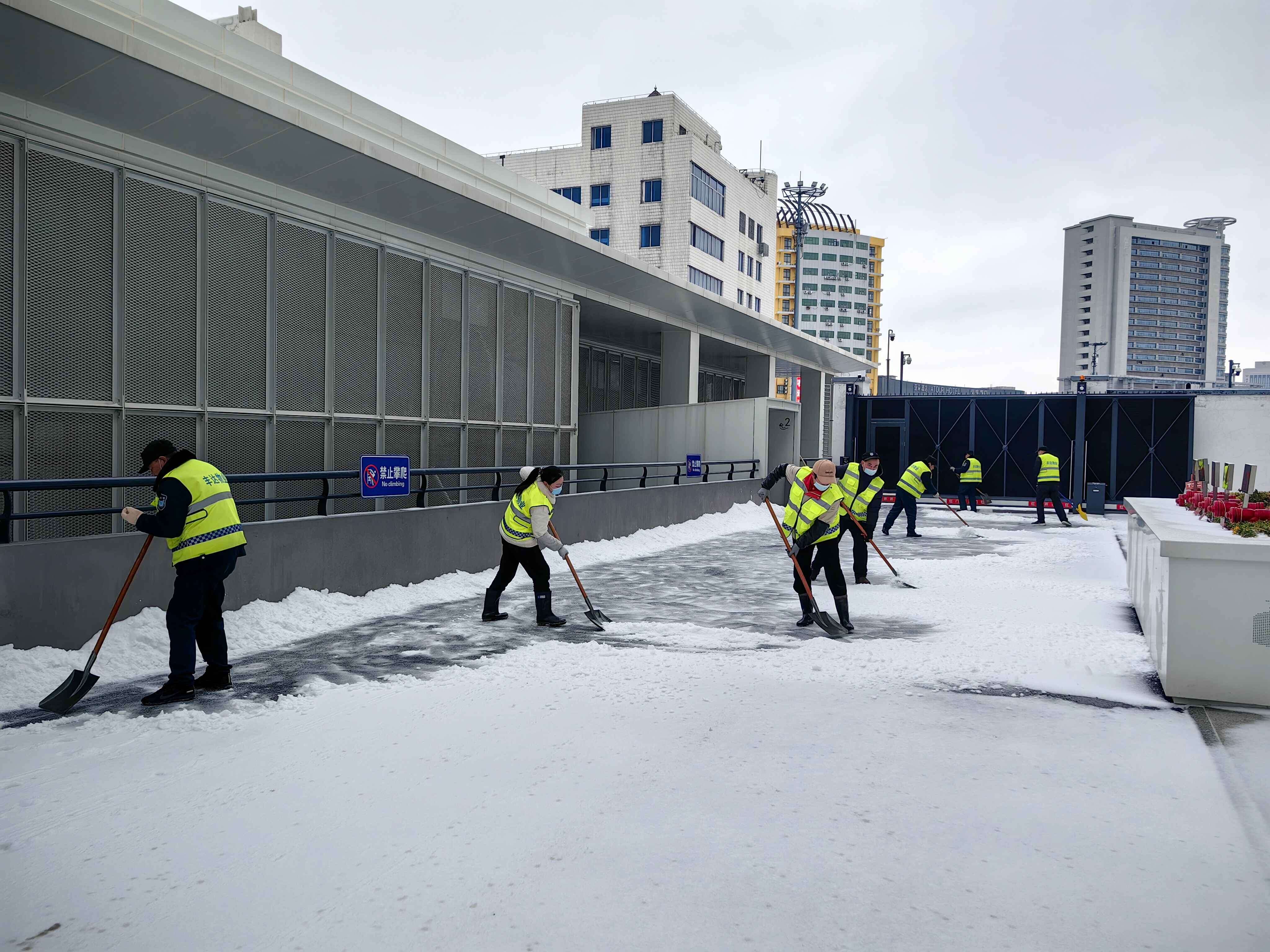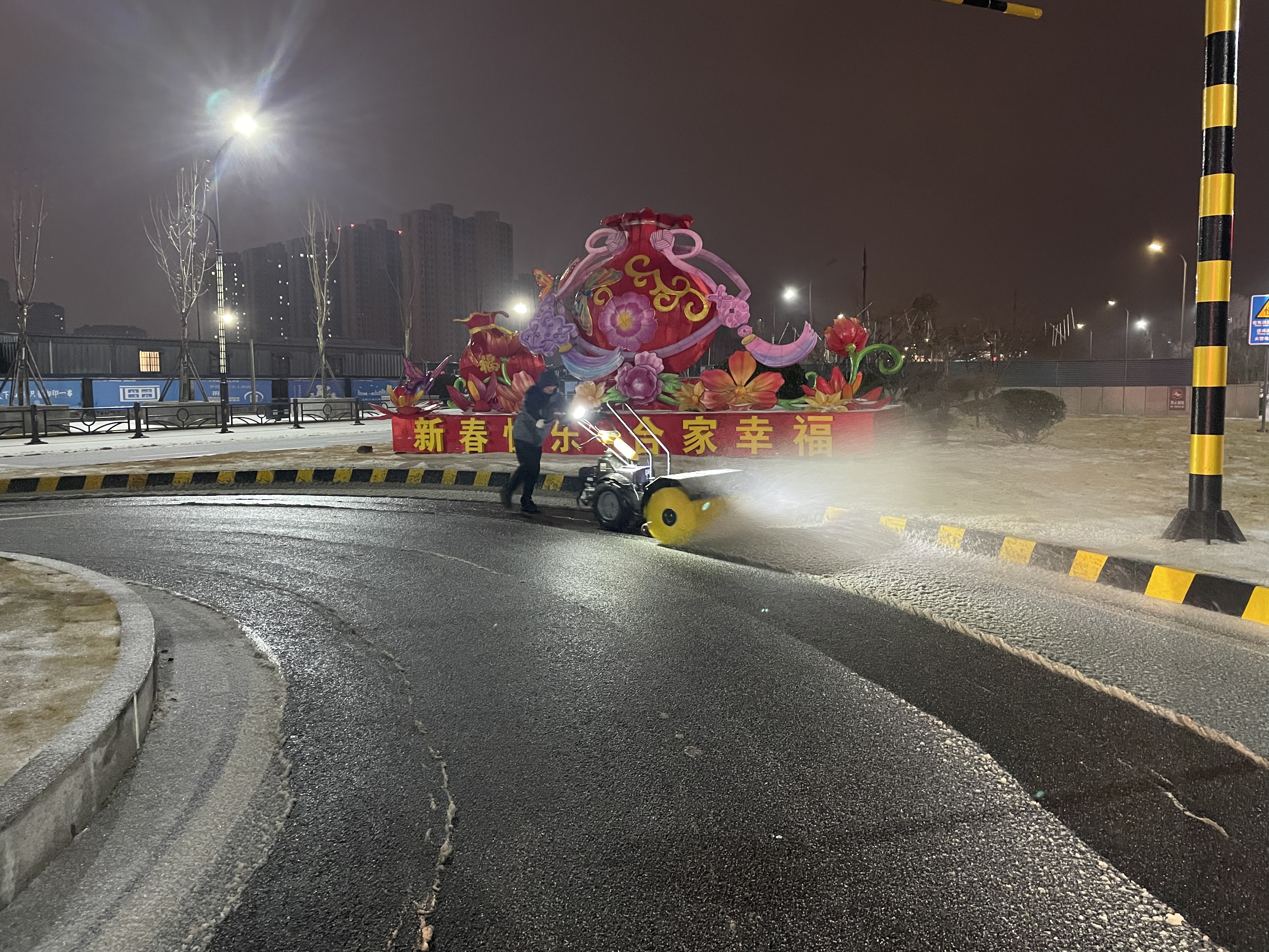 截止21日上午8点,共出动了撒布一体机15台,铲雪车9台,其他机械设备19台套,人员200人次,撒布融雪剂600余吨。