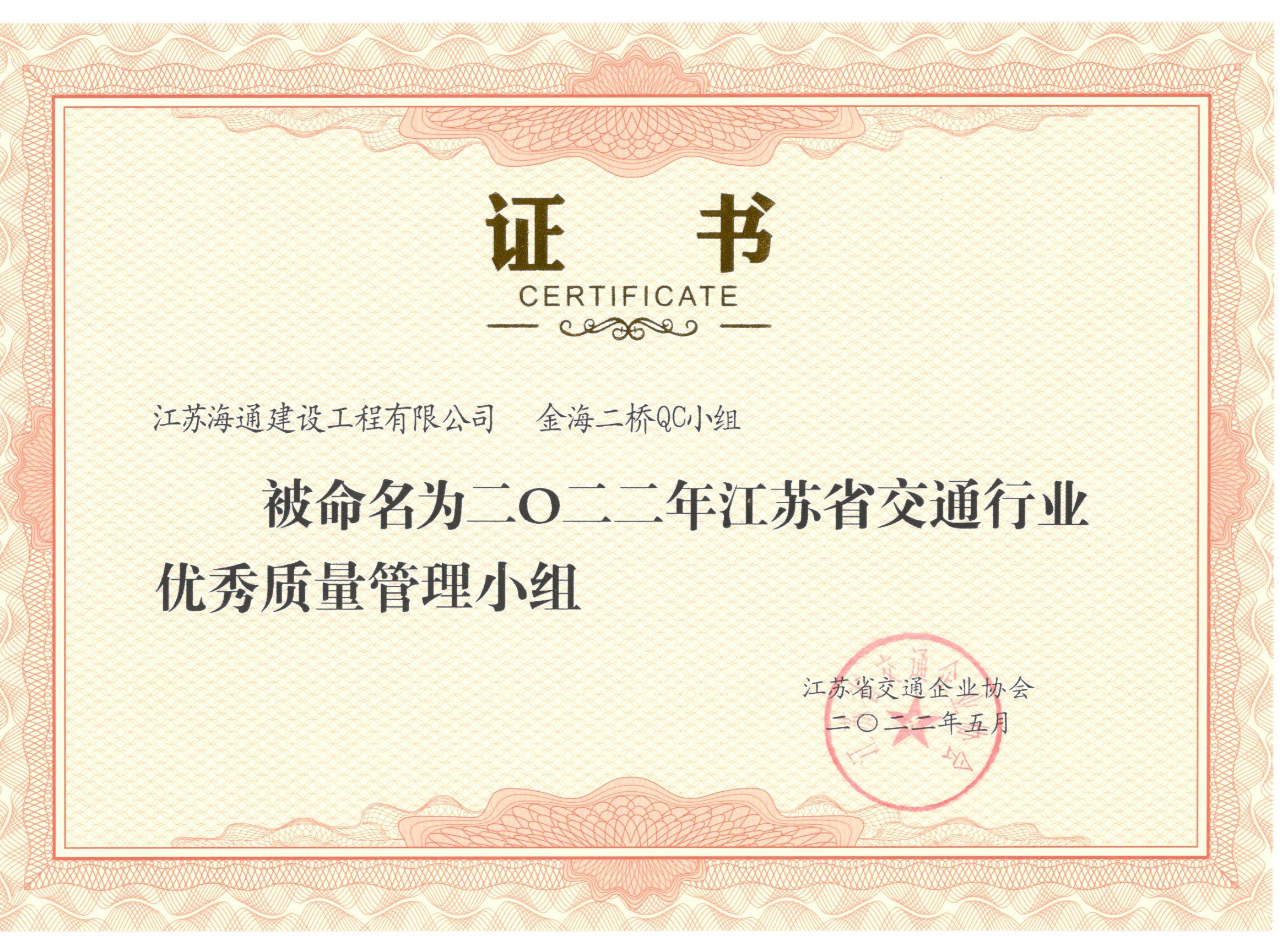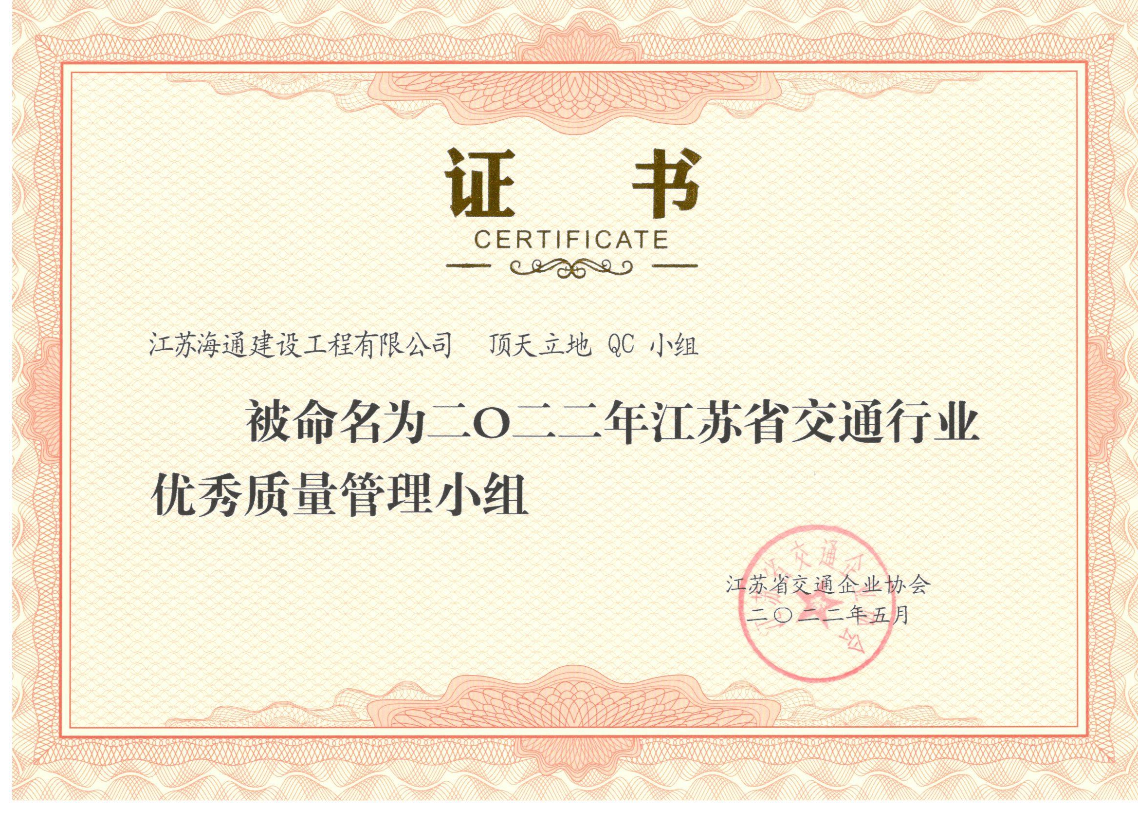 江苏海建公司荣获2022年度江苏省交通行业优秀质量管理小组及成果奖
