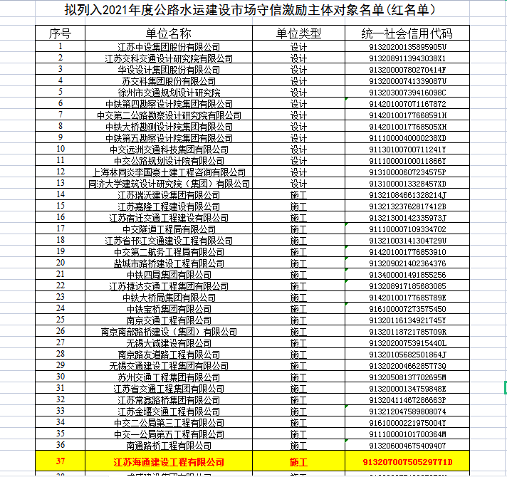 近日,从江苏省交通运输厅相继公布的《2021年度公路水运建设市场从业单位信用评定结果》和《2021年度公路水运建设市场守信激励和严重失信主体对象名单》文件中获悉,江苏海通建设工程有限公司2020年度、2021年度连续两年被评定为江苏省公路水运建设市场“AA”信用单位,并进入江苏省公路水运建设市场守信激励单位名单(“红名单”),这是本企业成立以来获得的最高信用评价,也是连云港市唯一获此两项殊荣的公路水运施工企业。