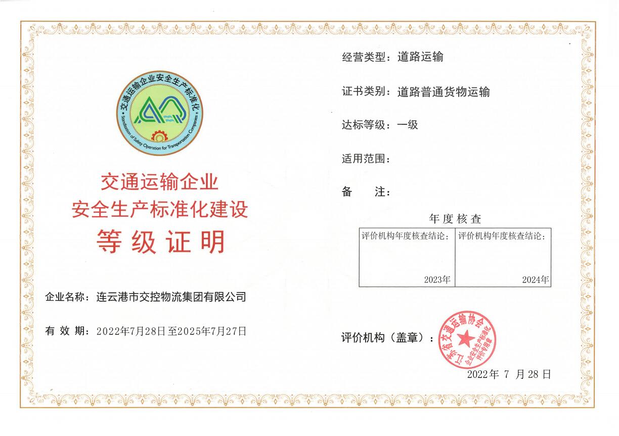8月5日,物流乐玩app最新版下载,乐玩(中国)通过道路运输企业安全生产标准化一级换证评审。自2018年启动安全生产标准化建设以来,物流乐玩app最新版下载,乐玩(中国)通过强化基础,完善管理,促进安全生产长效机制建设,于2019年获得交通运输部颁发的“企业安全生产标准化一级证书”,2022迎来第一次换证复评。