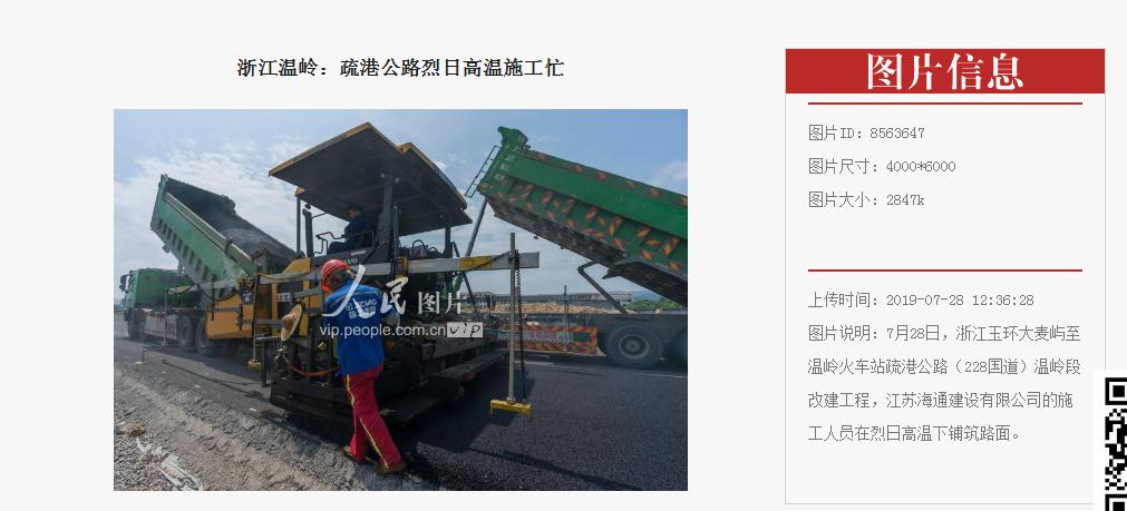 7月28日人民网刊登了浙江玉环大麦屿至温岭火车站疏港公路(228国道)温岭段改建工程,江苏海通建设有限公司的施工人员在烈日高温下铺筑路面的一组图片。为确保今年10月1日通车,江苏海通的建设者们在烈日高温下坚持施工,为保质保量完成施工任务付出自己的辛勤劳动和汗水。