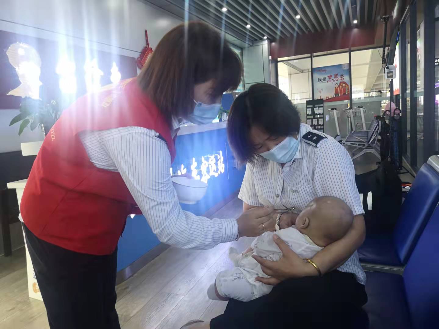 9月26日下午,连汽雷锋车驿站内一名带着婴儿满脸愁容的年轻男子引起了“雷锋车”手车良梅和薛莹的注意。看着哇哇啼哭的婴儿,两人急忙走上前询问,得知原本夫妻二人带着两个月大的宝宝从苏州返回连云港老家。刚到火车站,宝妈就接到东北老家的电话,她的父亲突患脑梗急需手术。宝妈焦急万分,没出站又赶去徐州转车。宝爸带着孩子出站后,来到雷锋车驿站等待家人接回灌云。因为是新手爸爸,照顾孩子经验不足,再加上走得匆忙,奶粉奶瓶都没带,孩子饿的哇哇哭喊。