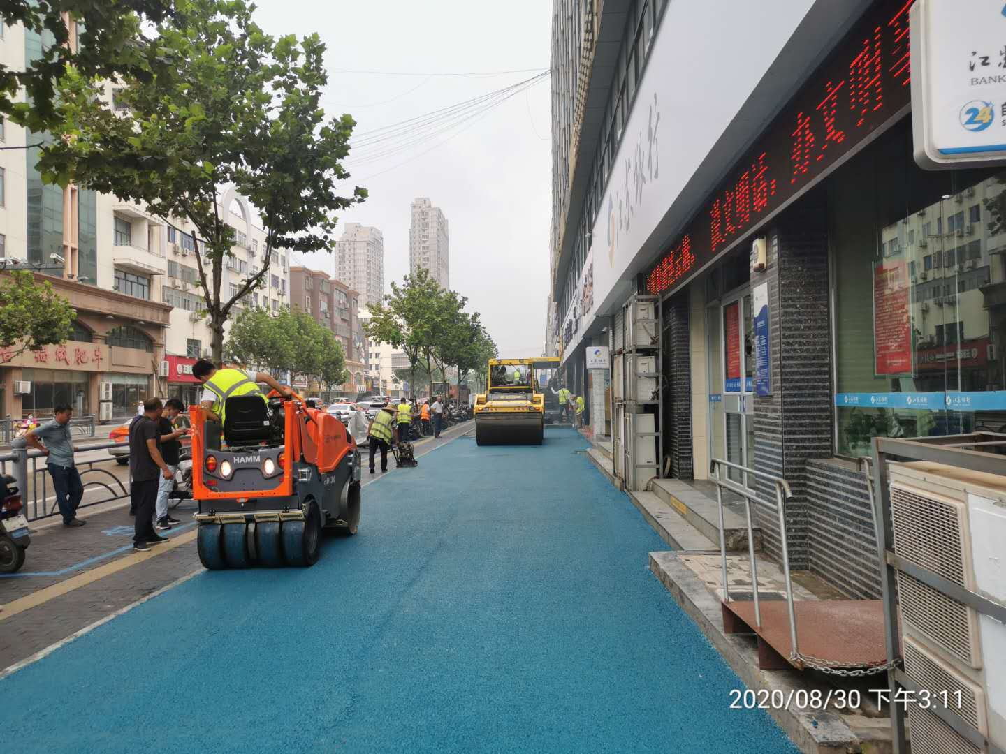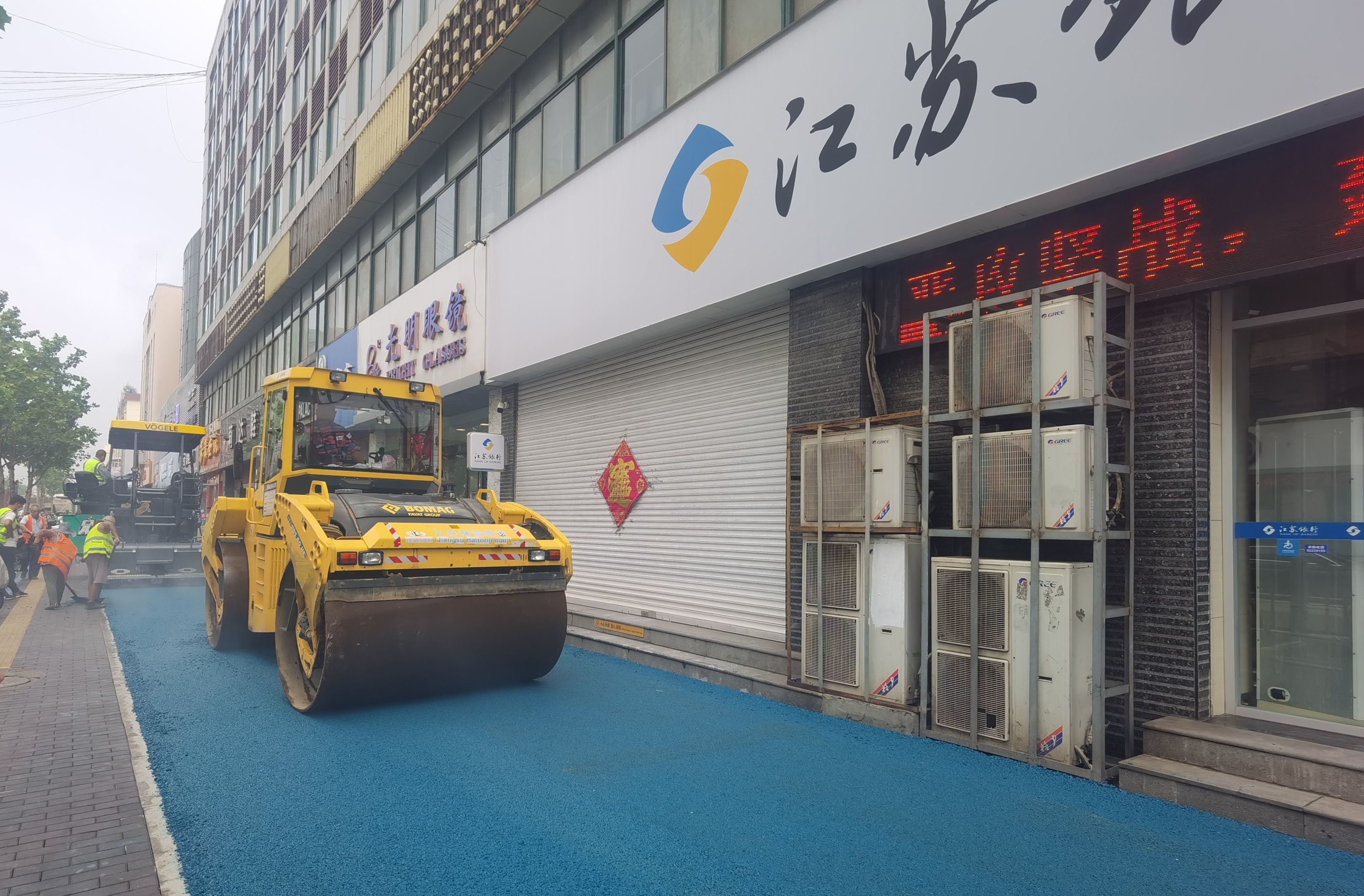 日前,由江苏海通建设工程有限公司承建的连云区中华东路商铺周边道路改造项目成功摊铺首条彩色沥青路面。在绿树高楼的掩映下,沥青路面宛若一条蓝色丝带向远方延伸,为街头增添了一抹“中国蓝”,同时也为海建公司今后的市政工程、园区道路工作拓宽了思路。
