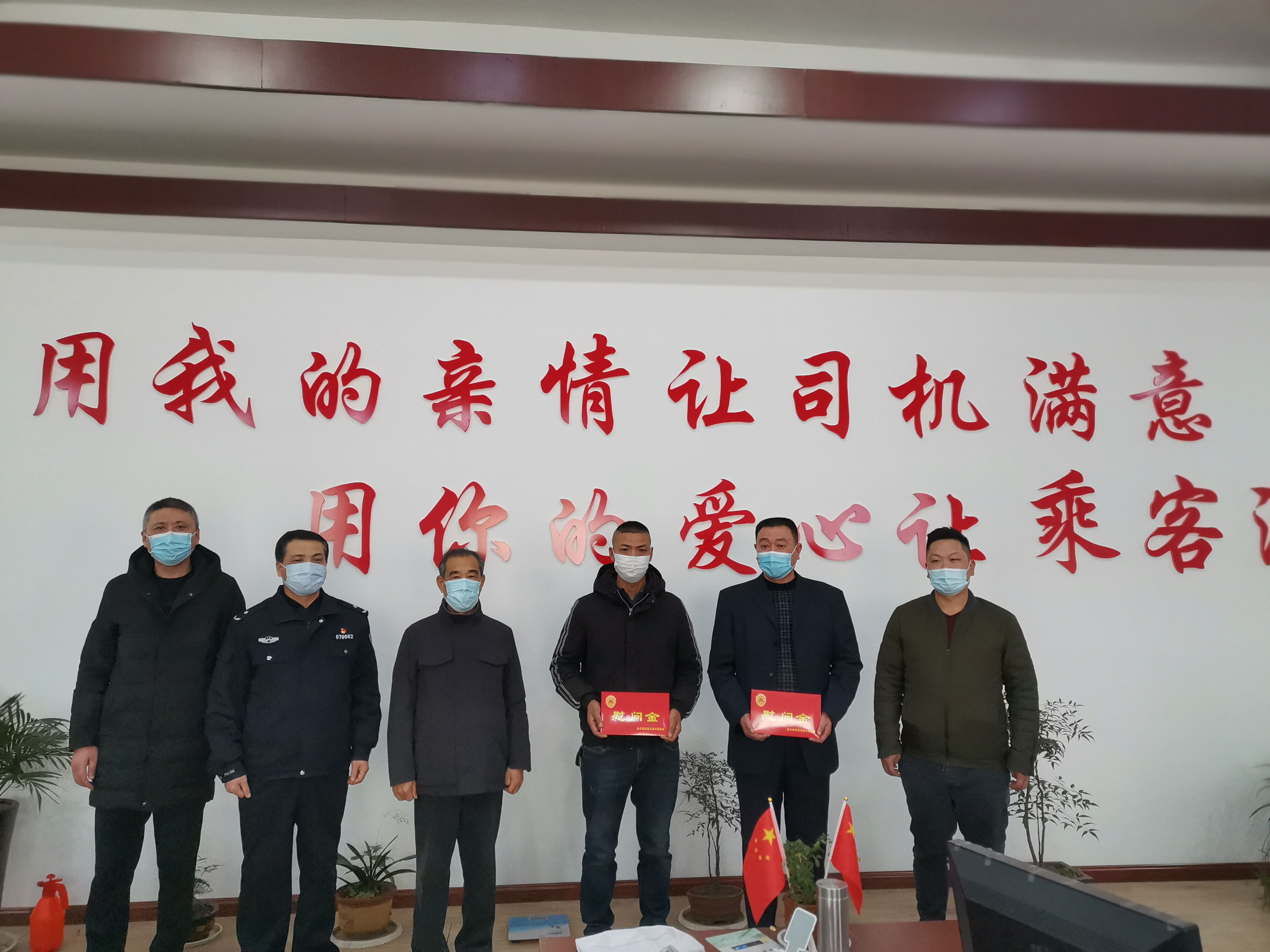 为了进一步弘扬见义勇为精神,关爱见义勇为人员,根据《市政府办公室关于进一步加强见义勇为人员权益保护的实施意见》,在2022年新春佳节前夕,1月19日下午,市见义勇为基金会理事长曹玉和、市公安局主任赵斯斌等一行5人组成慰问小组到全福出租公司看望慰问了“省十大见义勇为好司机”潘振银和孙朝廷两位的哥,并为他们送上了慰问金。