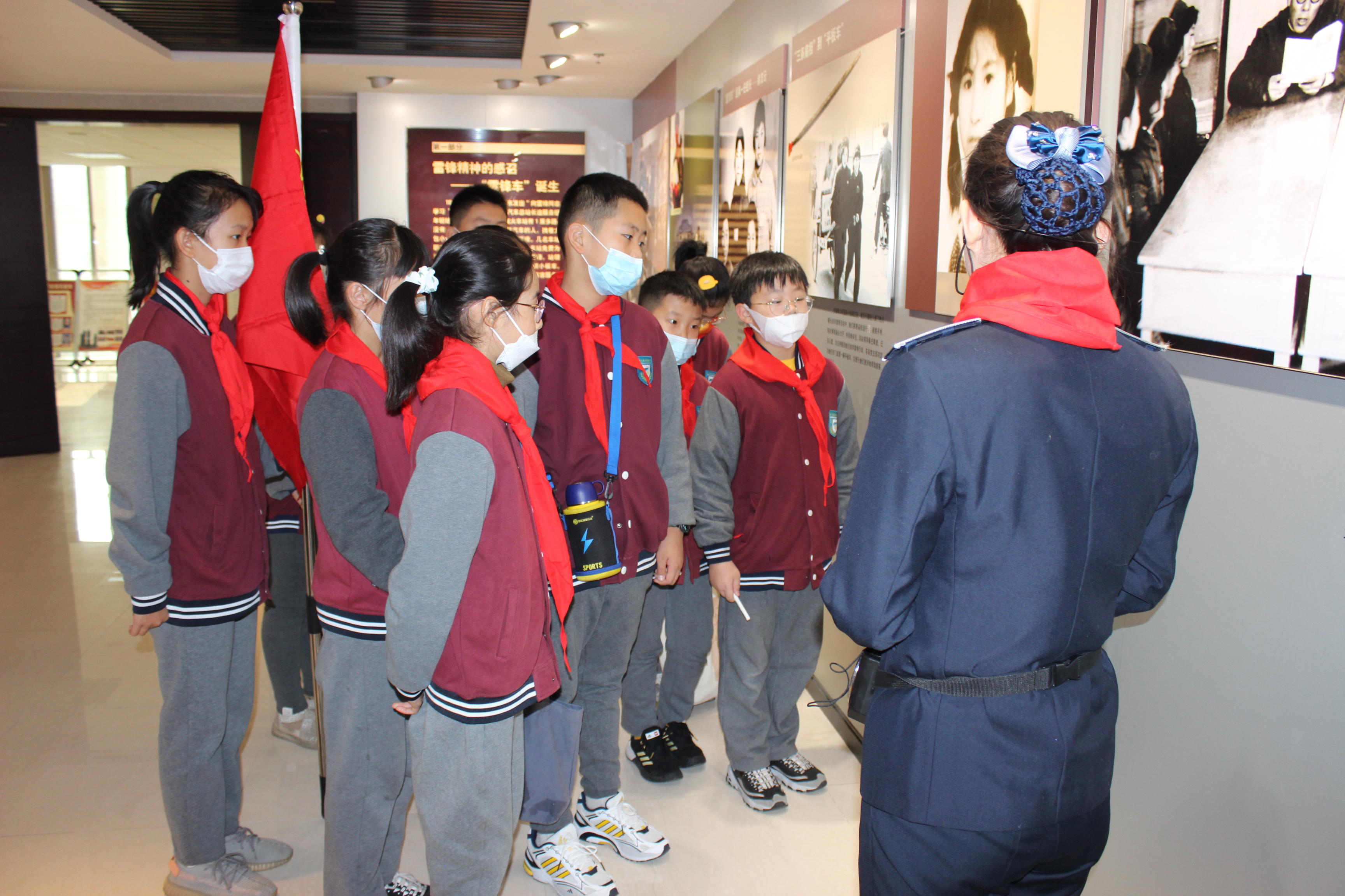 同学们跟随着少先队队旗,走进“雷锋车”事迹陈列馆,为讲解员李园园佩戴红领巾。他们跟随讲解员的脚步,认真聆听雷锋车手的感人事迹,观看图片、历史实物,了解雷锋车的更迭发展。当讲解员说到起初“雷锋车手们使用的平板车时,同学们格外好奇,他们中的大部分从未见过平板车,纷纷凑到车前抚摸观察,感叹雷锋车手的艰辛,喊起了“向‘雷锋’手阿姨学习”的响亮口号。