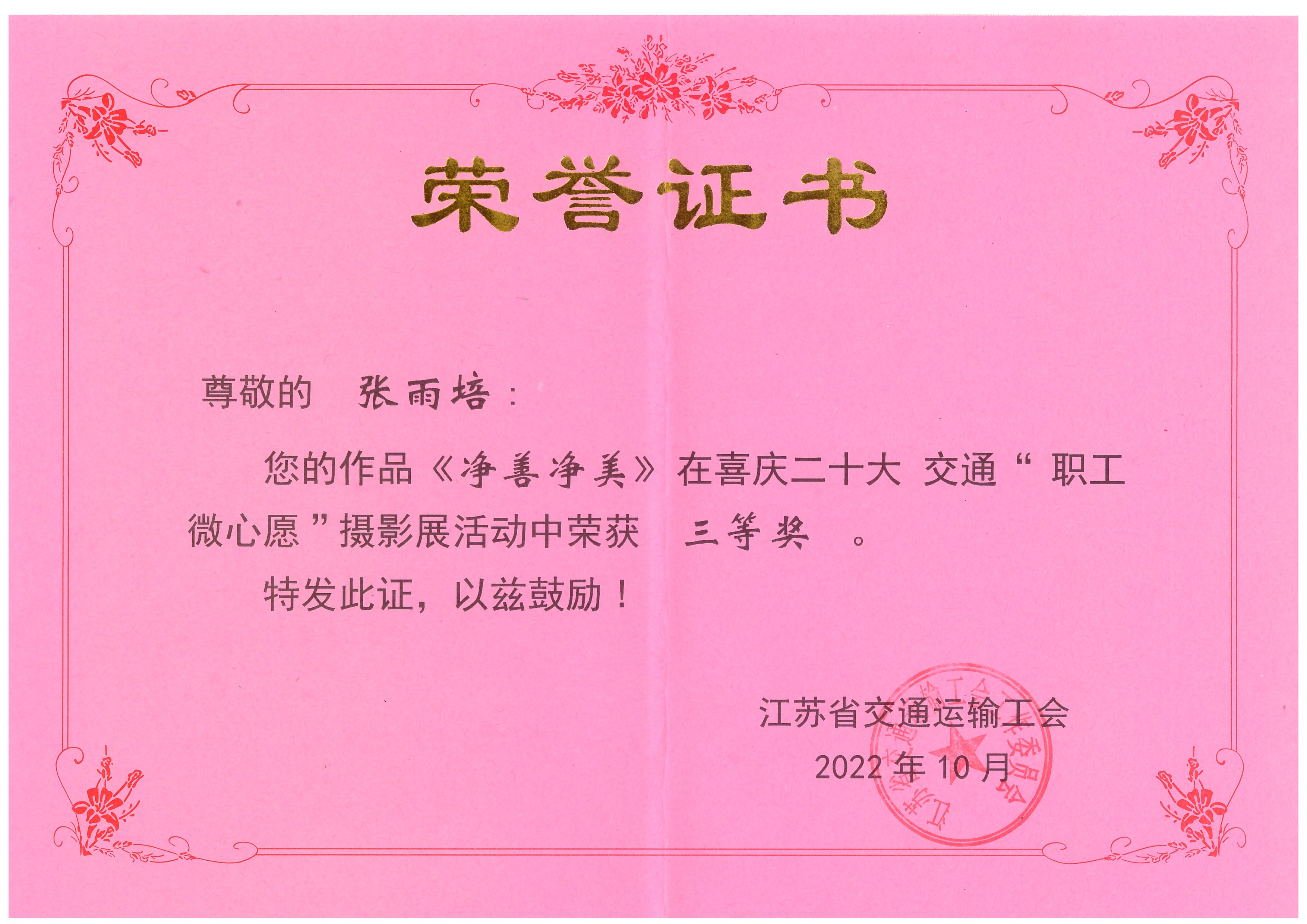 近日,从江苏省交通运输工会传来喜讯,连云港市公交乐玩app最新版下载,乐玩(中国)职工张雨培的摄影作品《净善净美》在喜庆二十大交通“职工微心愿”摄影展活动中荣获“三等奖”。