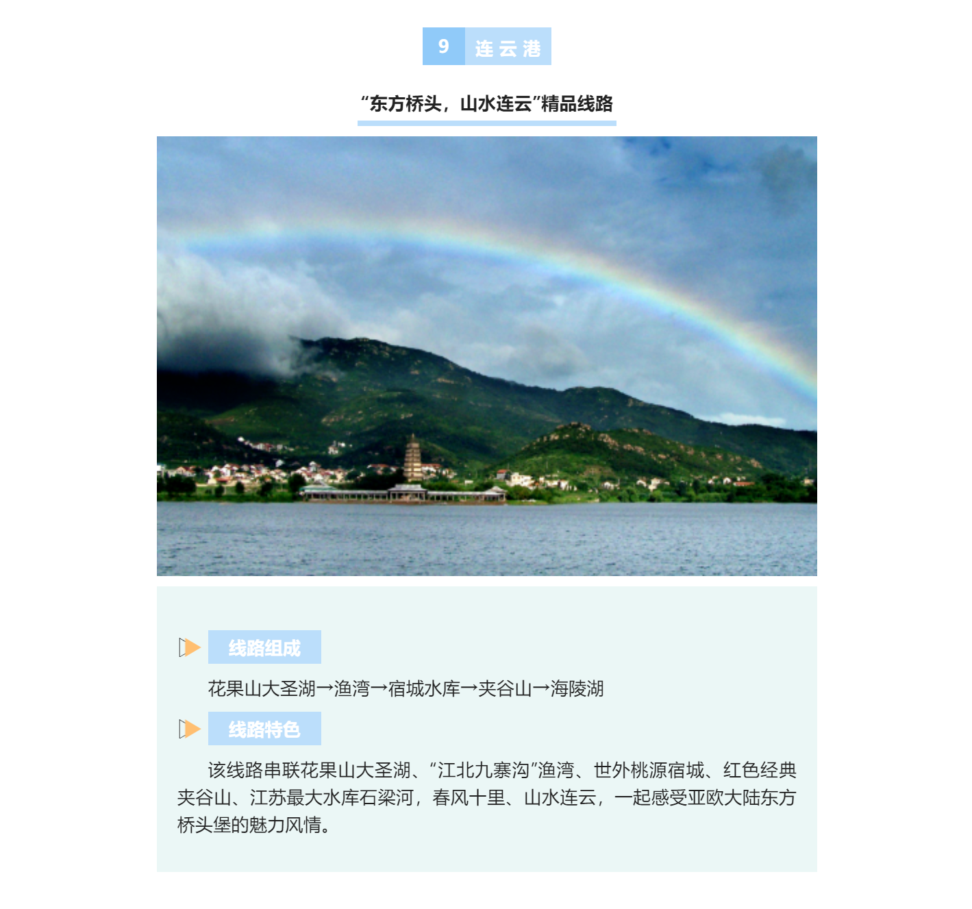 石梁河水库(又名海陵湖)作为代表连云港市水利风景区精品线路的“豹尾”,是“东方桥头,山水连云”精品线路的“终点站”。该线路顺序为花果山大圣湖、渔湾、宿城水库、夹谷山、海陵湖,将我市“水风情”一脉串起,而石梁河水库作为其中唯一经生态修复后重焕大美的重量级水工程,将成为线路中最能体现人与自然共生共存的目的地。