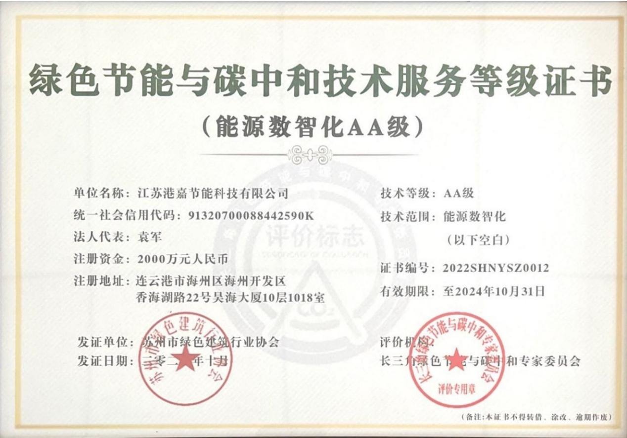 颁证仪式上,上海市节能工程技术协会副会长兼秘书长陈宏为江苏港嘉节能科技有限公司颁发“绿色节能与碳中和技术服务等级证书”。